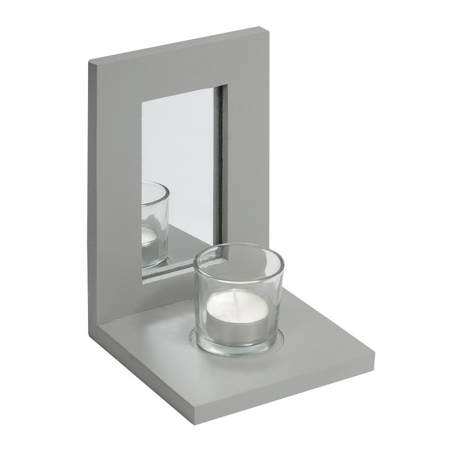 Szary świecznik Belldeco to pomysł na rozświetlenie mieszkania delikatnym, ciepłym płomykiem, którego moc potęguje lustrzane odbicie. Świecznik, bowiem posiada małe lustro w szarej, dość szerokiej ramce. Świeczka natomiast, przeznaczona jest do umieszczenia w szklanym naczynku, ulokowanym w wygodnym otworze stojaka.
