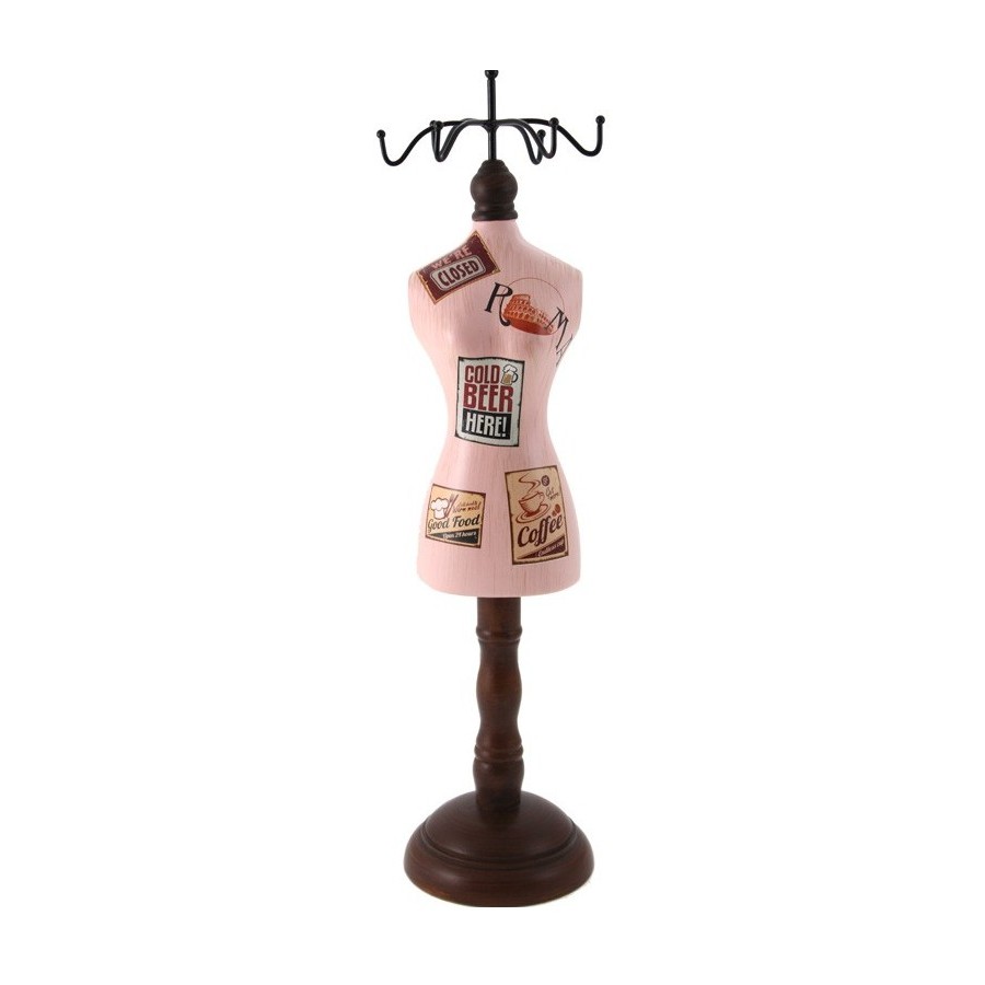 Stojak na biżuterię wykonany z drewna i metalu to bardzo ładna ozdoba pokoju, której górna część stanowi ładnie zaokrąglone haczyki w brązowym kolorze. Centralna część stojaczka to ozdoba w kształcie damskiego korpusu, pomalowana na różowo i ozdobiona ciekawym nalepkami. Stojaki na biżuterię w stylu retro wyglądają bardzo interesująco - polecamy!