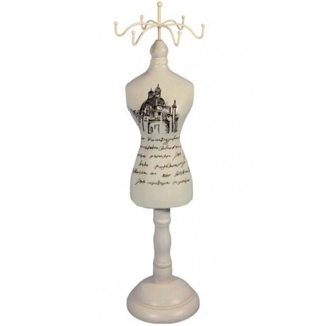 Kremowy stojak na biżuterię, wykonany w stylu retro to wyjątkowa figurka manekina o kobiecej sylwetce, przeznaczona do przechowywania na nim biżuterii. Stojaczek wykonano z metalu i drewna. W górnej jego części umieszczono wygodne, ładnie zakręcone haczyki na kosztowności. Centralną część ozdobiono obrazkiem klasycznej świątyni oraz pięknie wykonanym napisem. Cudowne stojaki na biżuterię - polecamy!