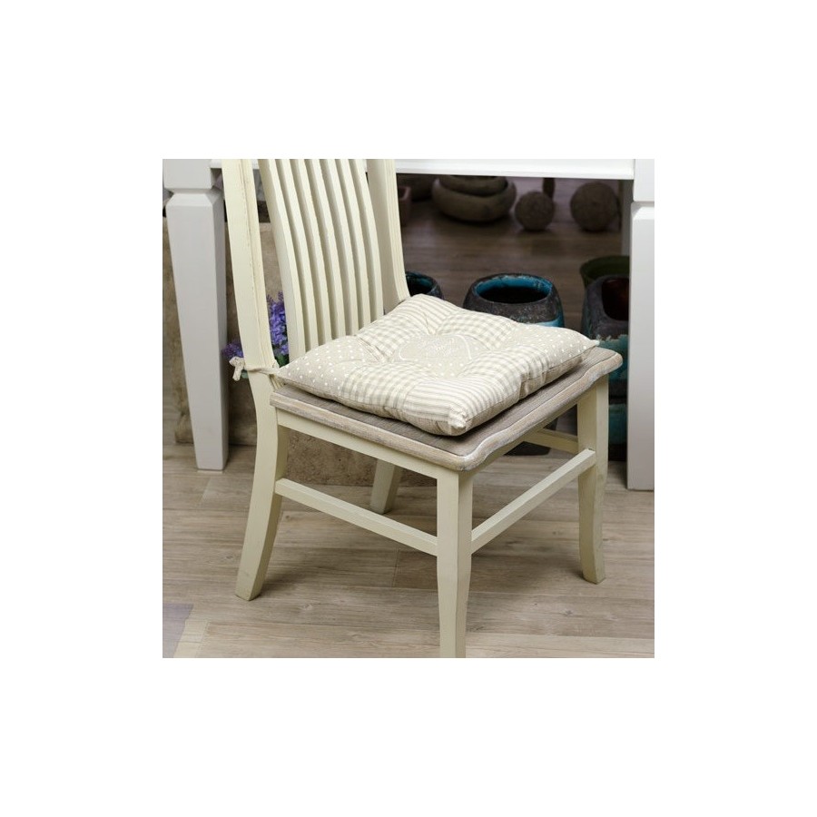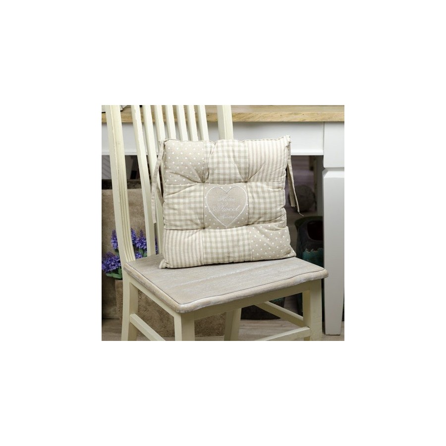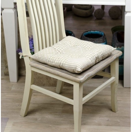 Poduszki na krzesło Sweet Home to poduszeki w stylu prowansalskim w beżowym kolorze. Poduszki posiadają dwie tasiemki u góry, które służą do przymocowania jej do oparć krzeseł. Przedmioty ponadto, są bardzo ładnie zdobione w różny sposób – kropkami, paseczkami i krateczką. Polecamy inne poduszki w stylu prowansalskim!