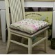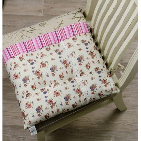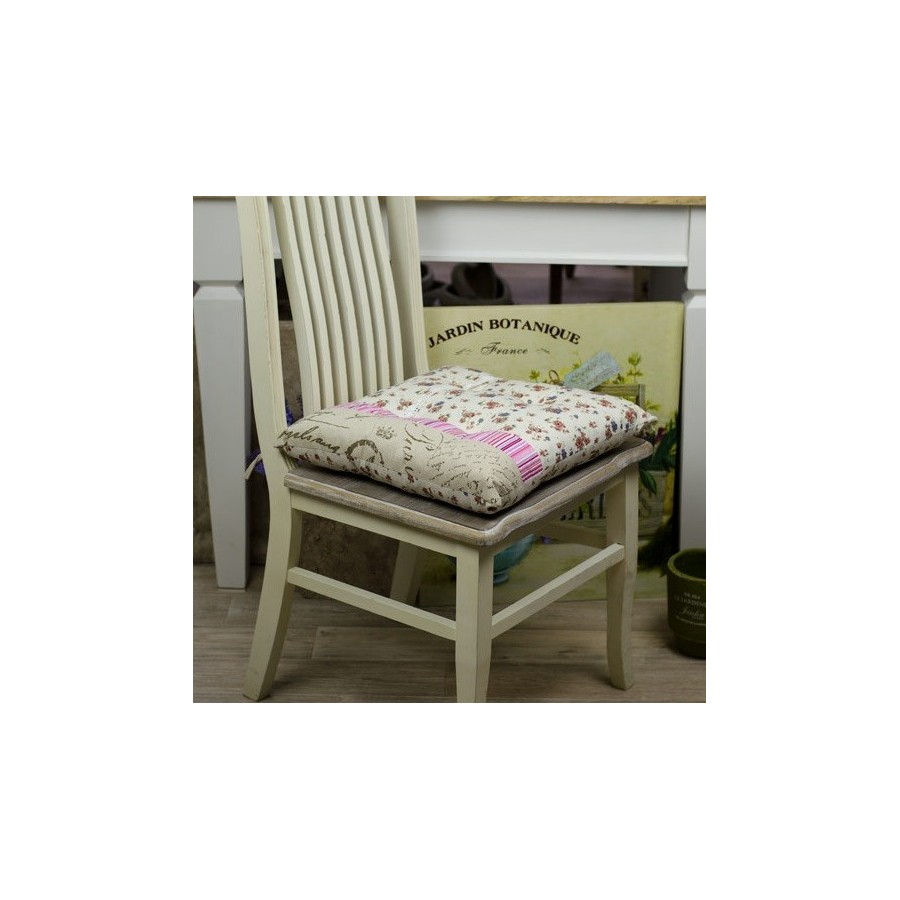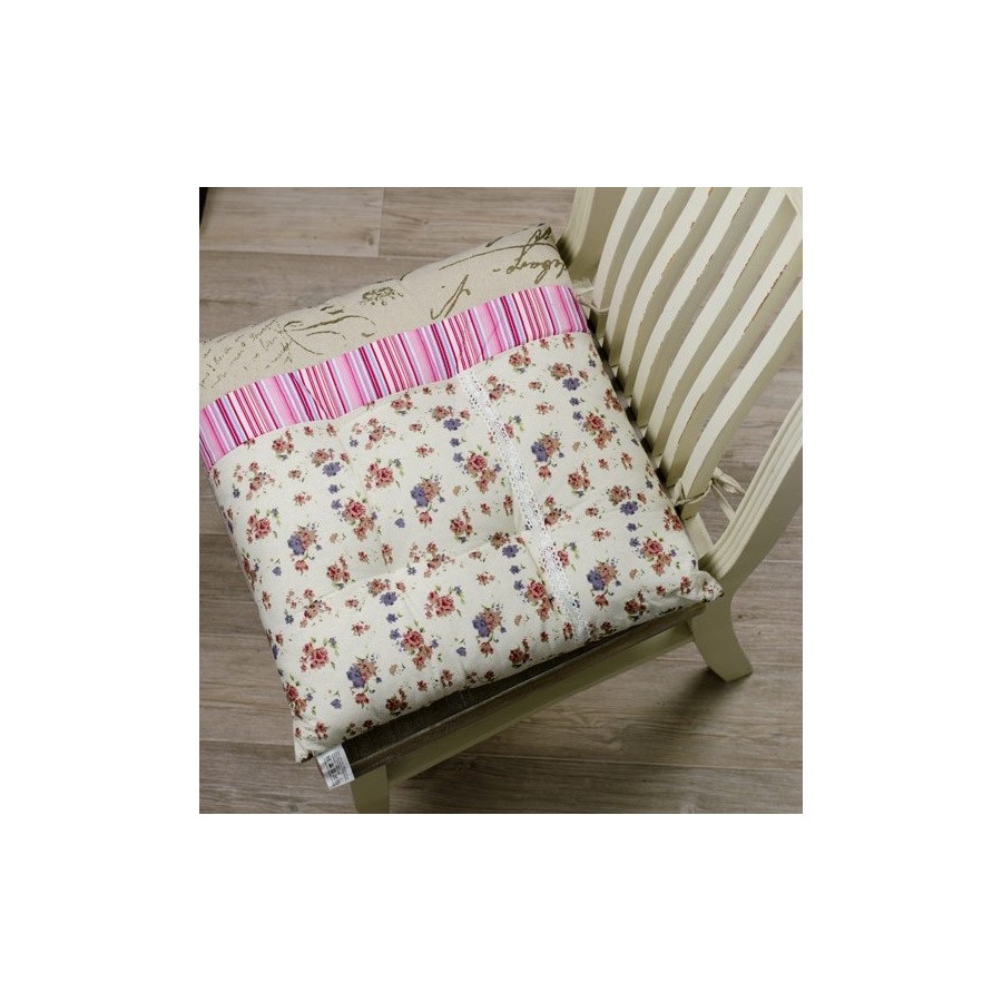 Poduszka na krzesło w prowansalskim stylu, opatrzona trzema wzorami zdobień: kwiatami, paseczkami i napisami.