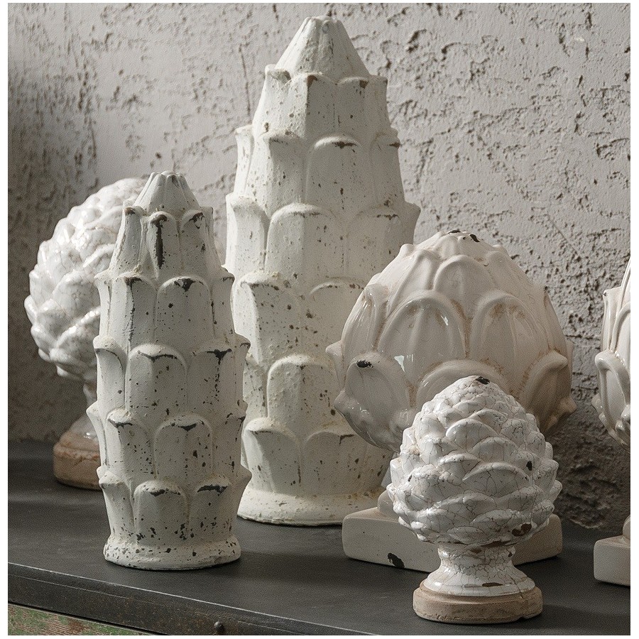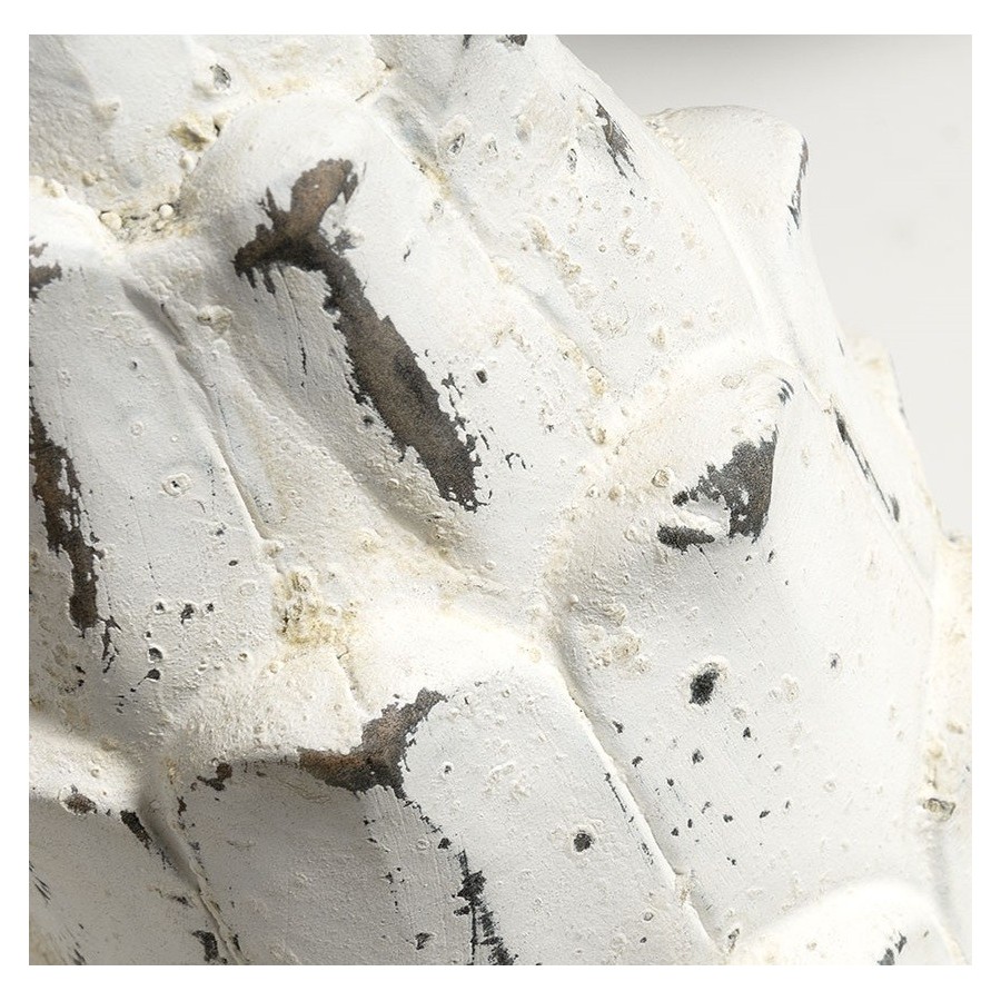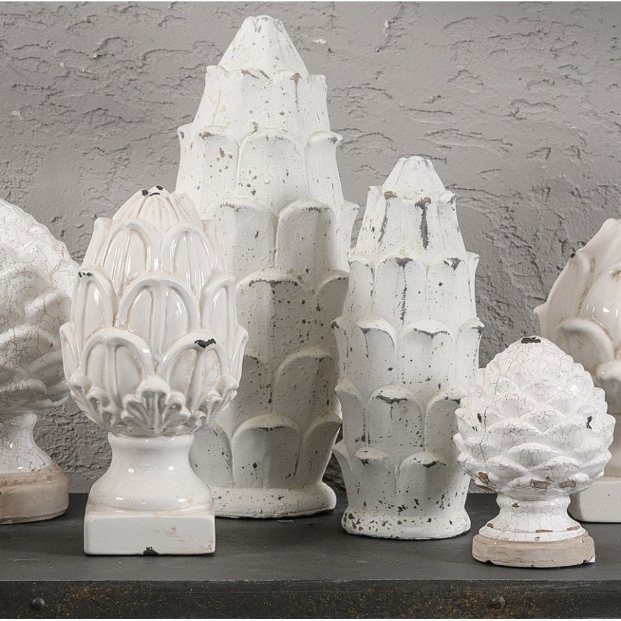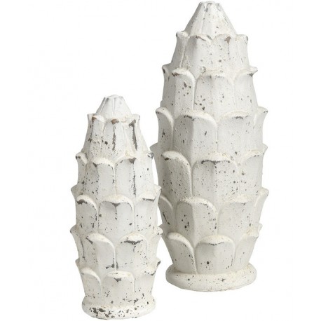 Karczoch ceramiczny w białym kolorze, wyposażony w postarzenia to wyszukana figurka o ładnym kształcie.