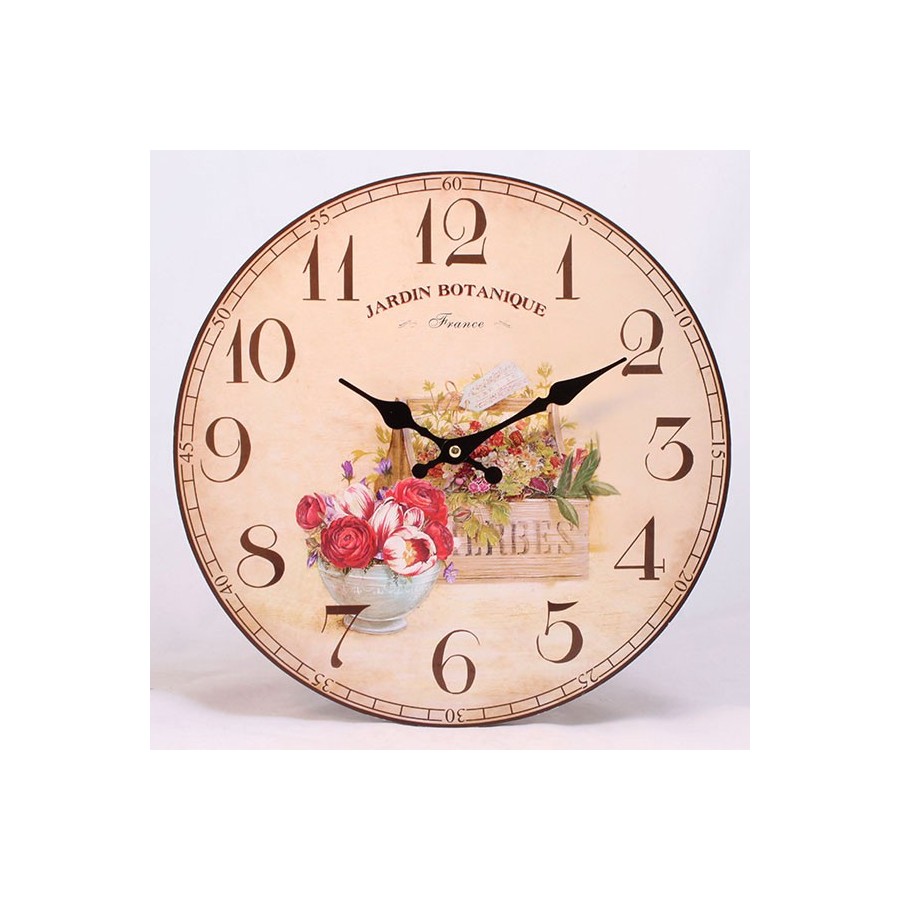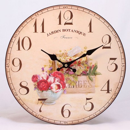 Zegar ścienny Prowansja to jeden z zegarów z kolekcji prowansalskiej o dużej, czytelnej, a zarazem uroczej czcionce cyfr umieszczonych na tarczy oraz o kształtnie wyciętych, czarnych wskazówkach. Ten gustowny, okrągły zegar ozdobiono rysunkiem różnobarwnych kwiatów w skrzyneczce i doniczce na tle jasnego brązu w ciepłym odcieniu. Polecamy inne zegary prowansalskie!