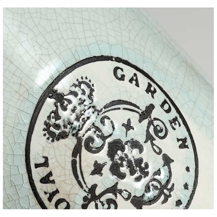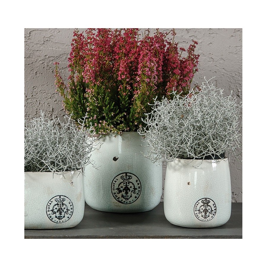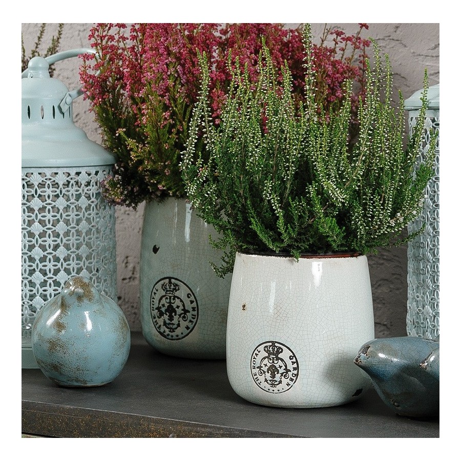 Osłonki w stylu prowansalskim to urocze doniczki ozdobione ładnie wykonanymi pęknięciami oraz czarnym stemplem.