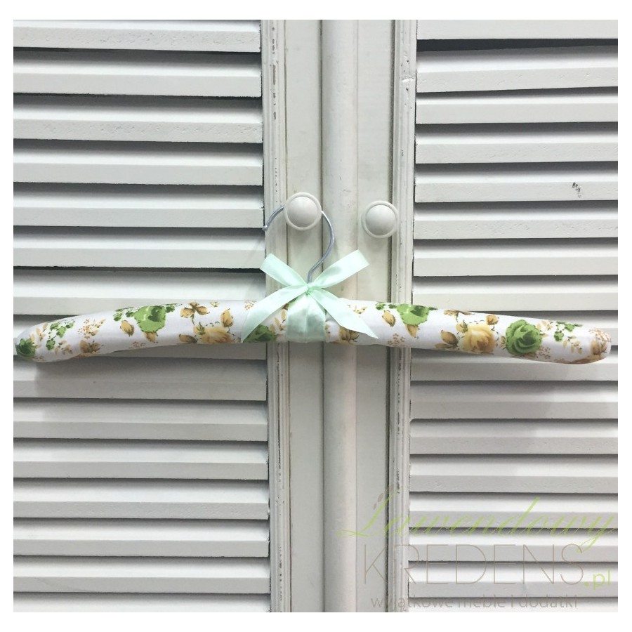Wieszaki materiałowe udekorowane zielonymi różami i bosko wyglądającą kokardką w kolorze mięty to wyjątkowa ozdoba, która w oryginalny sposób upiększy wnętrze szafy. Polecamy inne wieszaki na ubrania wykonane z materiału.