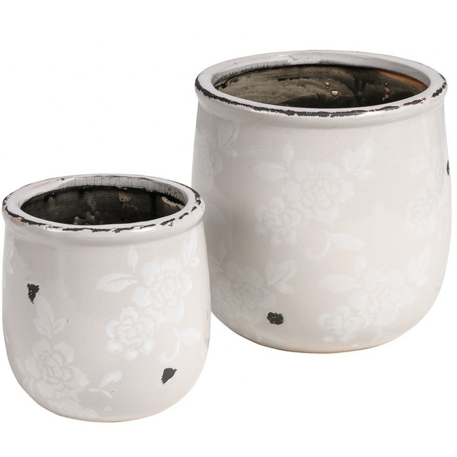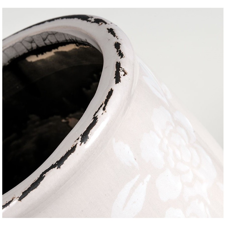 Osłonka na doniczki w kształcie obszernego słoja z ładnie wykonanymi postarzeniami to uroczy element dekoracyjny domu o funkcjonalnym charakterze. Osłonkę pomalowano na beżowy kolor, a następnie naniesiono na nią białe kwiaty. Polecamy inne równie urocze osłonki prowansalskie!