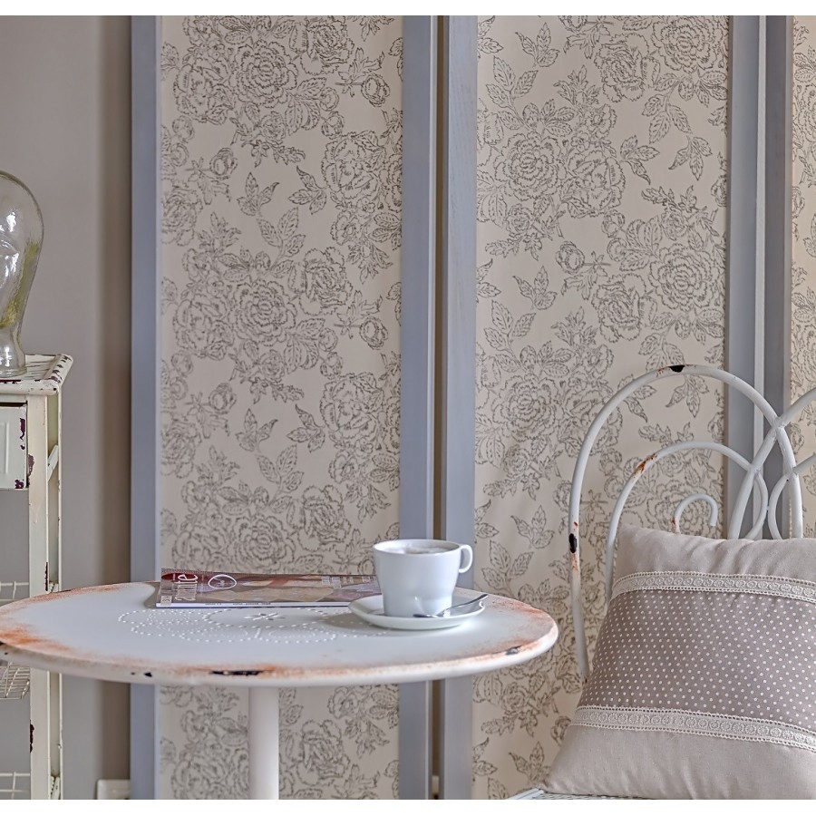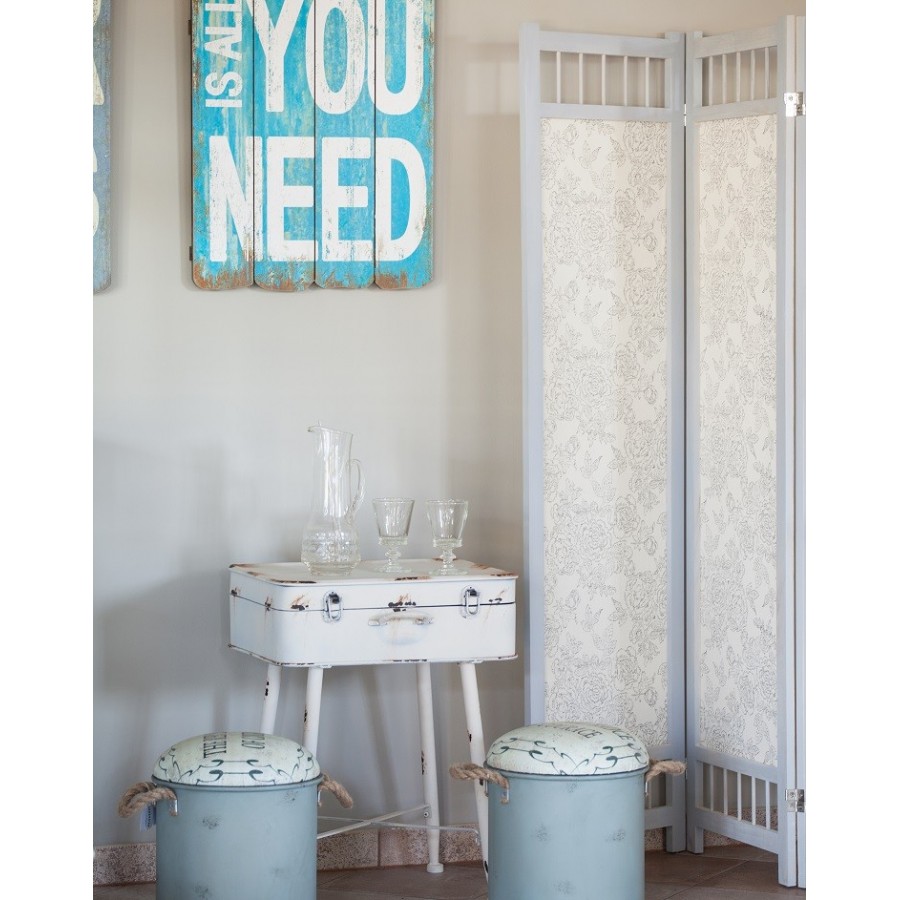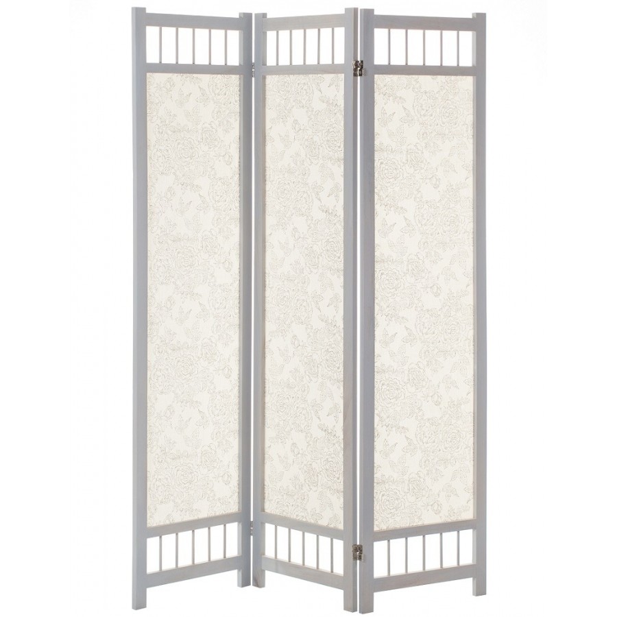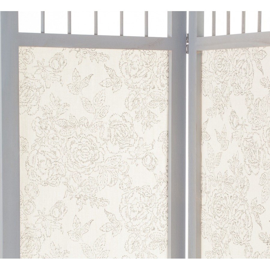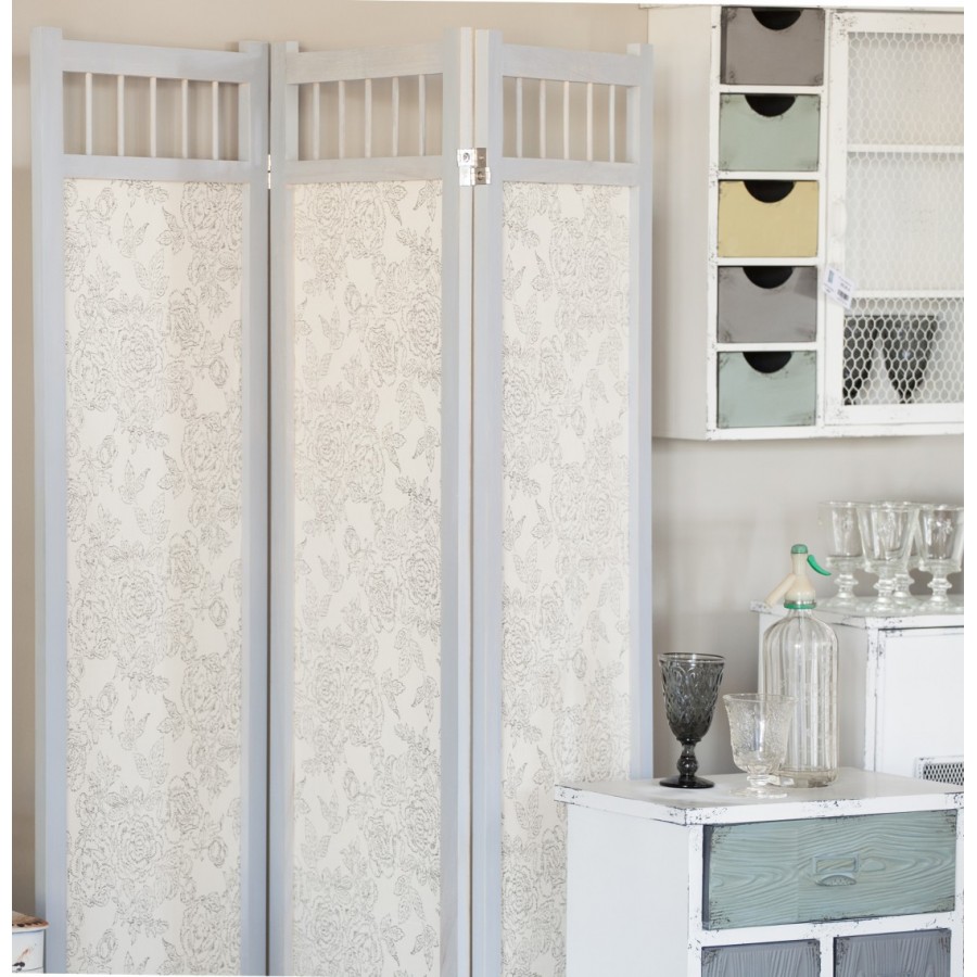Świetny, trójczłonowy parawan prowansalski. Jego większą część pokrywa tkanina w kwiatowe wzory w jasnej, delikatnej tonacji kolorystycznej. U góry parawan ma prześwitującą przestrzeń poprzedzielaną małymi deseczkami.
