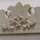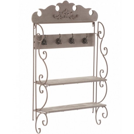 Piękna póka wisząca z dwiema drewnianymi półeczkami wkomponowanymi w artystyczne wykończenia metalowe.