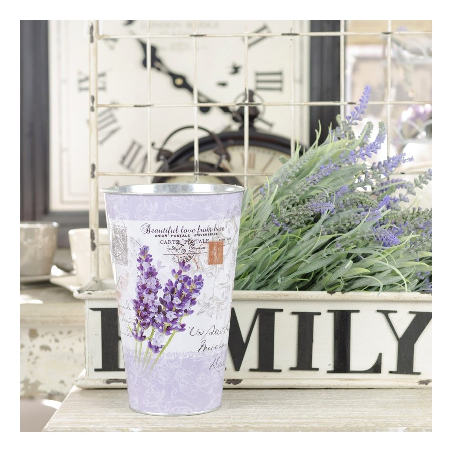Metalowe wazony prowansalskie, którym został nadany kształt wysokiego, ściętego stożka, zostały wykonane z metalu. Boki wazonu pokryto liliowym tłem, a w centralnej części umieszczono obrazek pocztówki okraszonej wizerunkiem gałązek prowansalskiej lawendy. Przedmiot wygląda kunsztownie i kształtnie – polecamy!