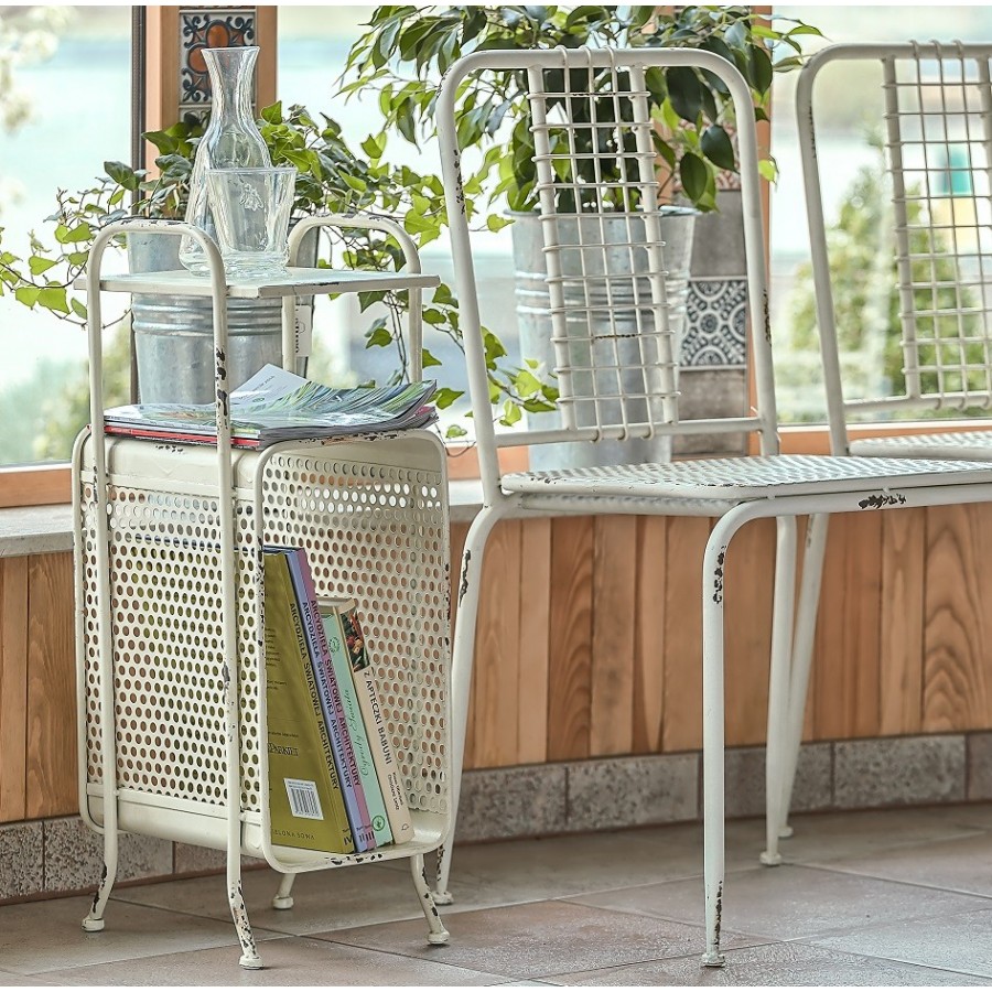 Stojak na gazety Lamali Aluro to metalowa konstrukcja wyposażona w obszerny pojemnik do przechowywania gazet oraz małą półeczkę u góry. Mebelek pomalowano na biały kolor i wyposażono w przetarcia. Polecamy inne meble przecierane Aluro!