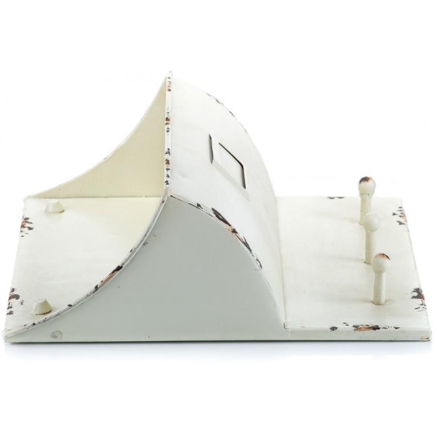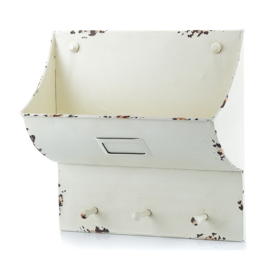 Ładnie wycięta, metalowa półka została wyposażona w trzy funkcjonalne wieszaki, które zakończono kuleczkami. Półka świetnie sprawdzi się, jako szafeczka na listy. Kolor półki Aluro to biel, którą urozmaicono przetarciami.