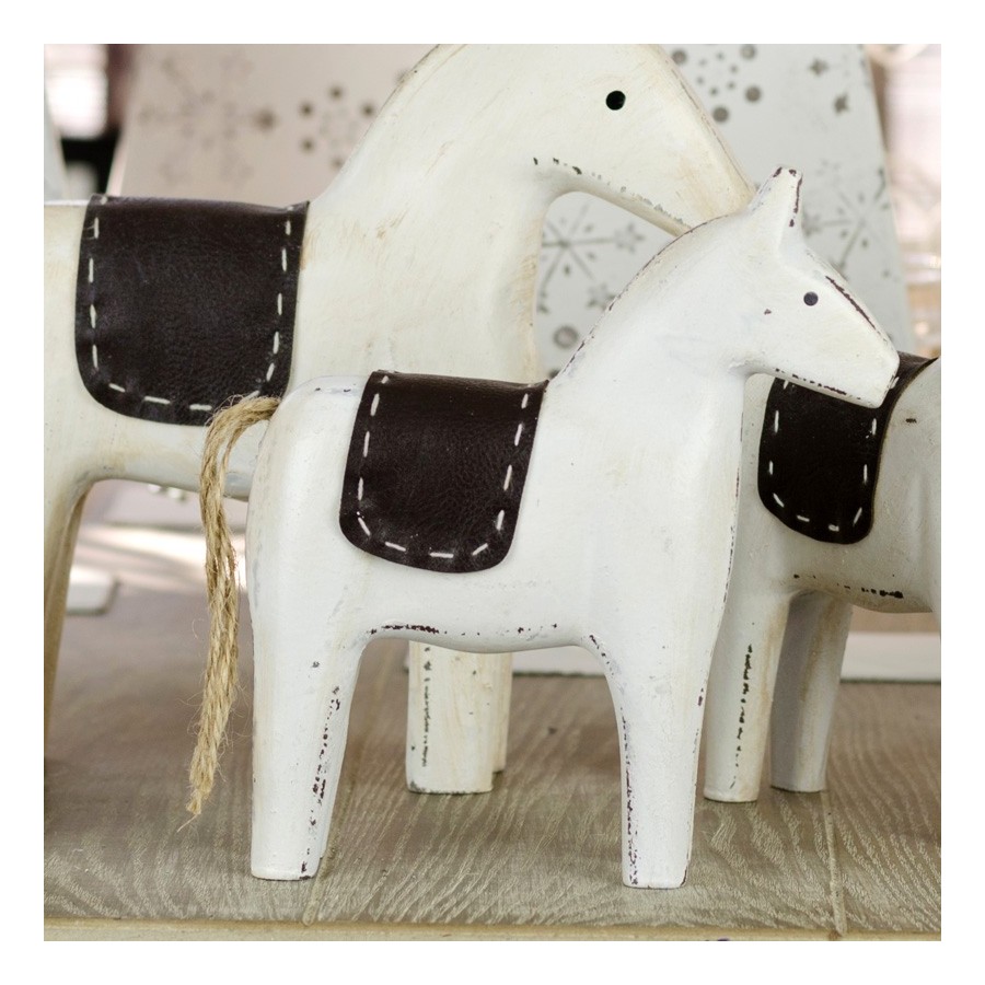 Konik drewniany to wyjątkowy przedmiot przeznaczony do ocieplenia i udekorowania pomieszczeń – świetnie sprawdzi się w pokoju dziecka, w kuchni, a także w salonie. Konik został wykonany z drewna, a następnie pomalowany na biało. Na grzbiecie zwierzęcia umieszczono ładne, brązowe siodło a ogon skonstruowano z lnianych sznureczków. Figurka posiada charakterystyczne przetarcia wykonane intencjonalnie.