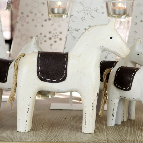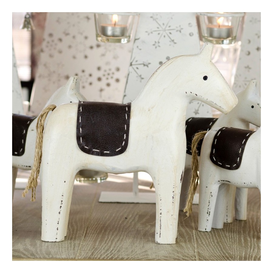 Drewniany koń w białym kolorze, został osiodłany przez artystę brązowym siodłem z białym szwem. Ogon konika składa się z lnianych sznurków, a oko to uroczo namalowana czarna kropka, usytuowana na pysku zwierzęcia. Figurka idealna do pokoju dziecięcego oraz innych pomieszczeń mieszkania zawiera przetarcia farby, co jest jedną z cech stylu prowansalskiego.