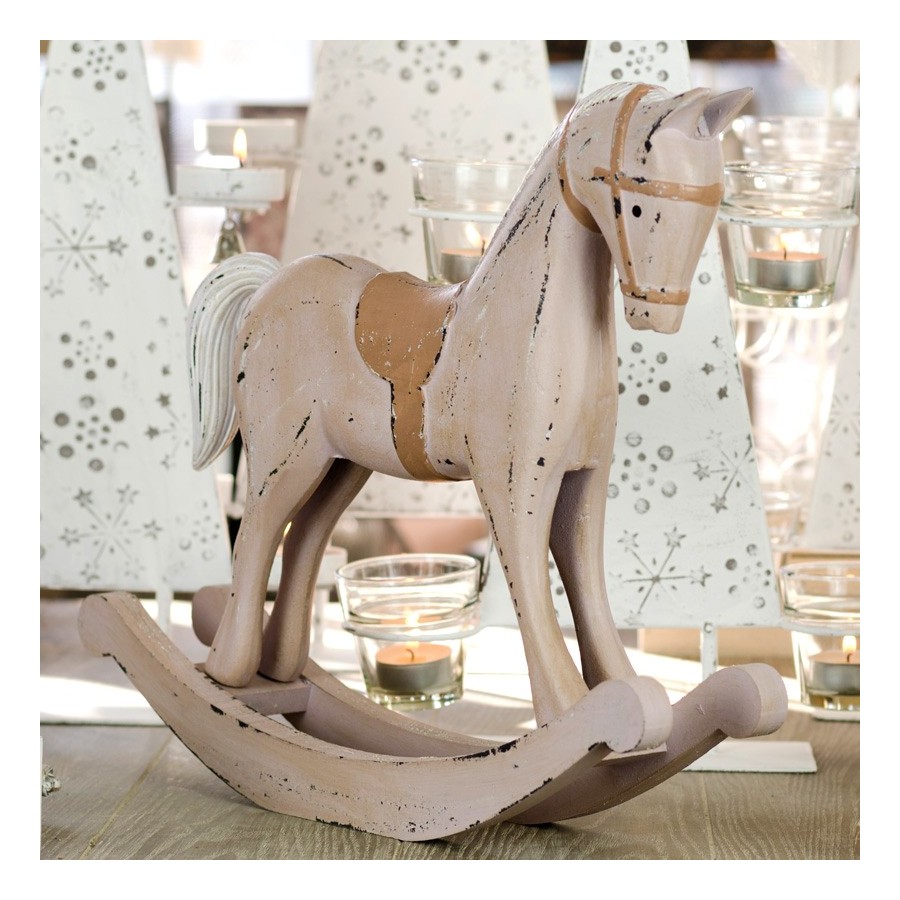 Duży koń drewniany na biegunach, służyć może jako niepowtarzalna ozdoba, zajmując miejsce w Państwa wnętrzach. Liczne otarcia i zadrapania mają przywołać ducha dawnych czasów i sugerować, że drewniany koń ma już swoje lata.