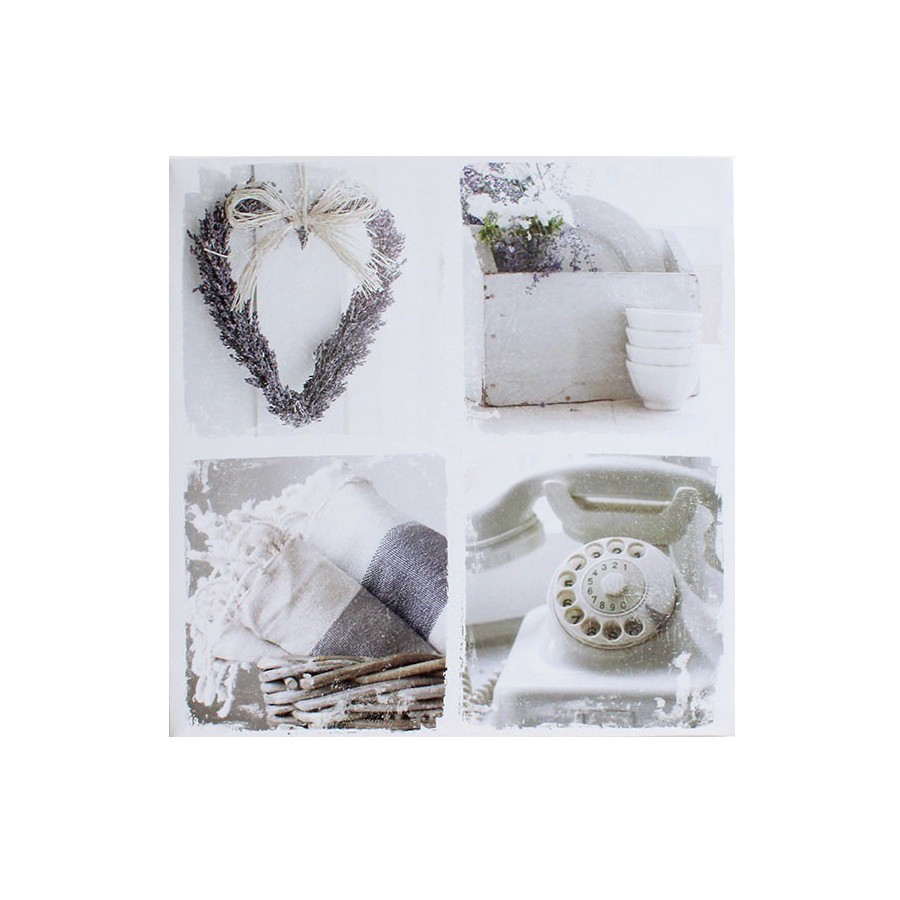 Cztery obrazki tworzące jeden obraz reprezentujący styl prowansalski, na których przedstawiono: lawendowe serce przewiązane wstążką, naczynia ozdobione lawendą, tkaniny w wiklinowym koszu oraz biały telefon w stylu retro. Obraz świetnie wpasuje się zarówno w przestrzeń kuchenną, łazienkową, będzie także wspaniałym dodatkiem na ścianę salonu.