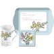 Piękny, porcelanowy kubek z tacką z motywem dwóch różnobarwnych ptaszków siedzących na gałązce pełnej kwiatów w rozkwicie. Całość uzupełniona jest o napis w języku angielskim(na kubku i na tacce). Ponadto do zestawu dołączona jest korkowa podkładka w podobnej stylizacji i kolorystyce.