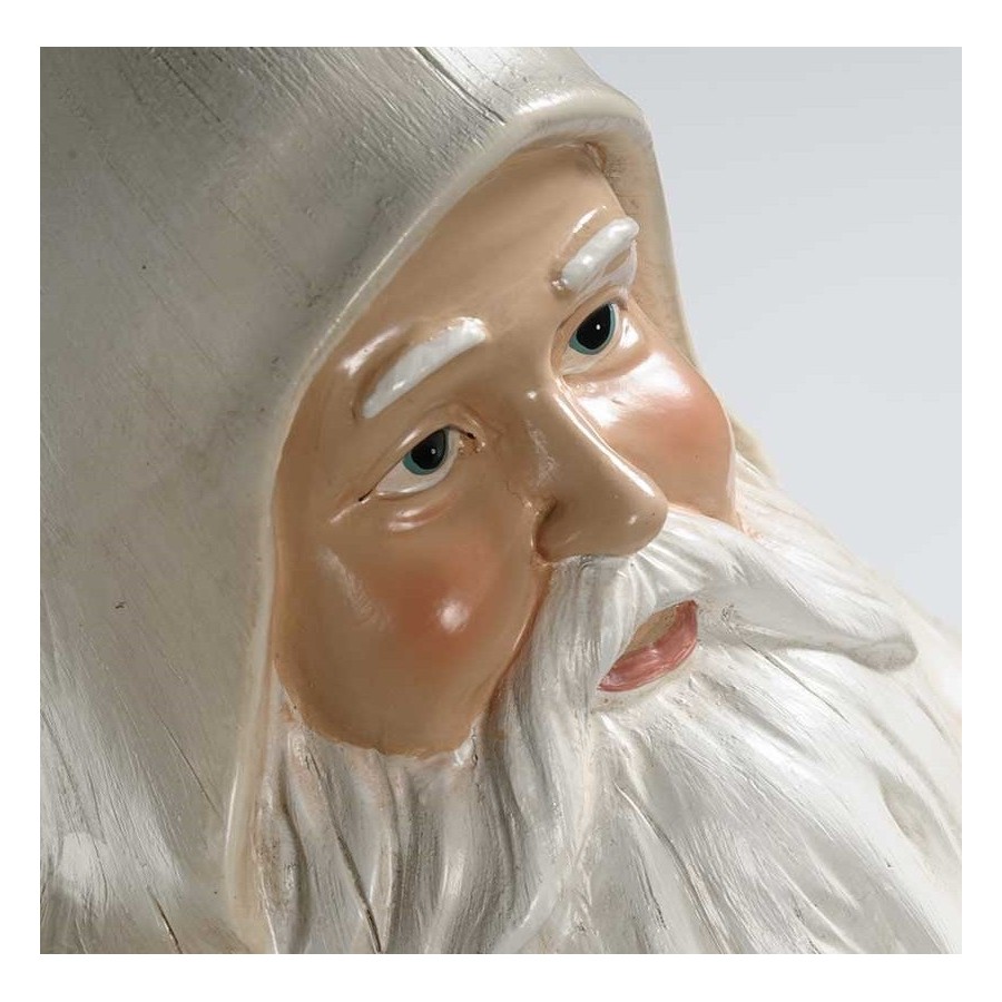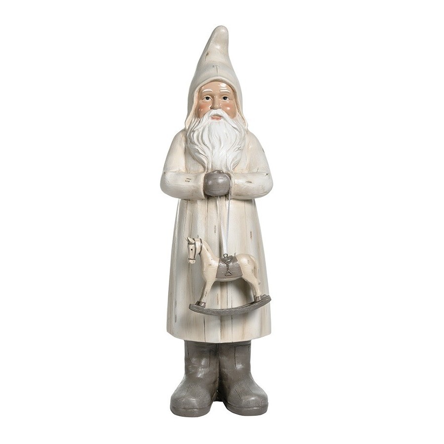 Duża, bajkowa figurka Mikołaja w jasnej tonacji kolorystycznej, z długą, białą brodą i konikiem na biegunach!
