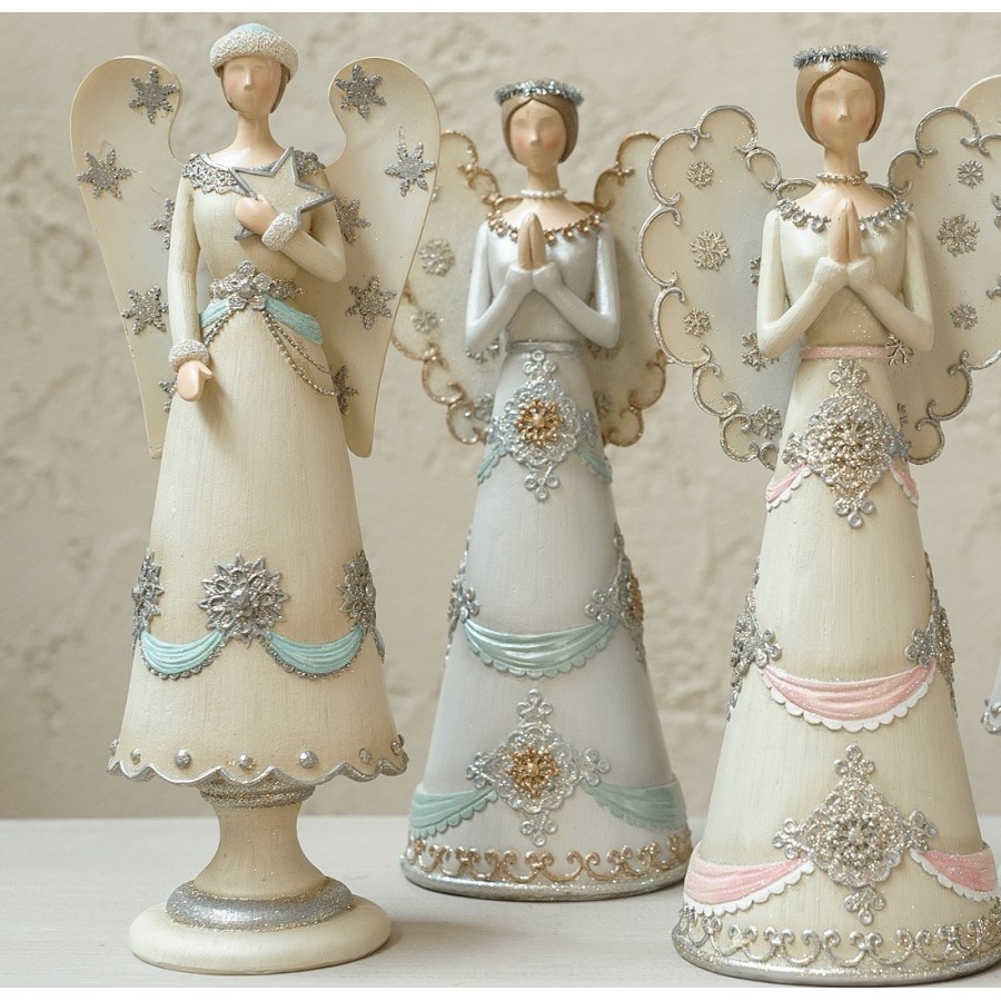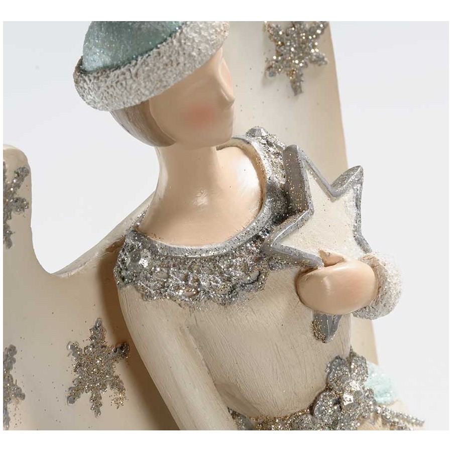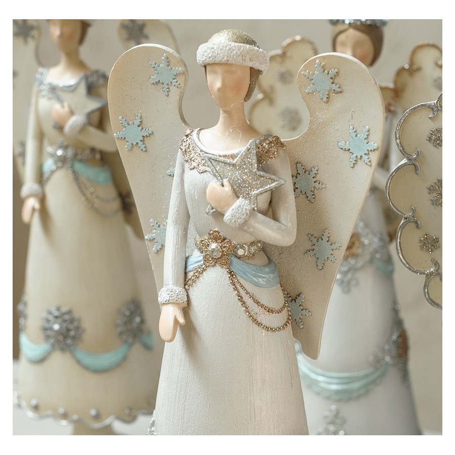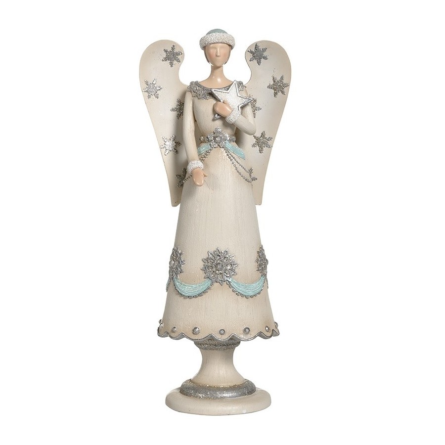Anioły Belldeco, których smukły i przepiękny kształt cudownie wpasuje się w wystrój świątecznie udekorowanego domu, to cudownie wykonane figurki. Anioł Belldeco z gwiazdą został ubrany przez artystę w białą suknię, ozdobioną srebrnymi płatkami śniegu oraz błękitnymi wstążkami. Skrzydła anioła zostały okraszone mieniącymi się gwiazdami o zgrabnej formie. Piękna, olśniewająca rzecz – idealna na święta Bożego Narodzenia!