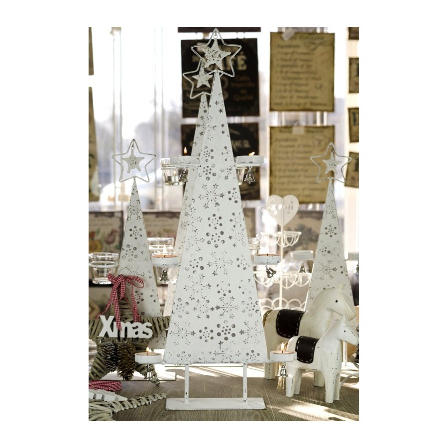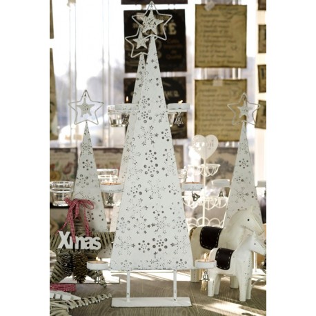 Choinka metalowa to nietypowa ozdoba, na której szczycie znajduje się gwiazda. Powierzchnię tego uroczego świecznika, pokrywa gwieździsty wzór o srebrnym kolorze. Przedmiot rozświetli świątecznie ozdobione pomieszczenie ciepłym, pomarańczowym blaskiem.