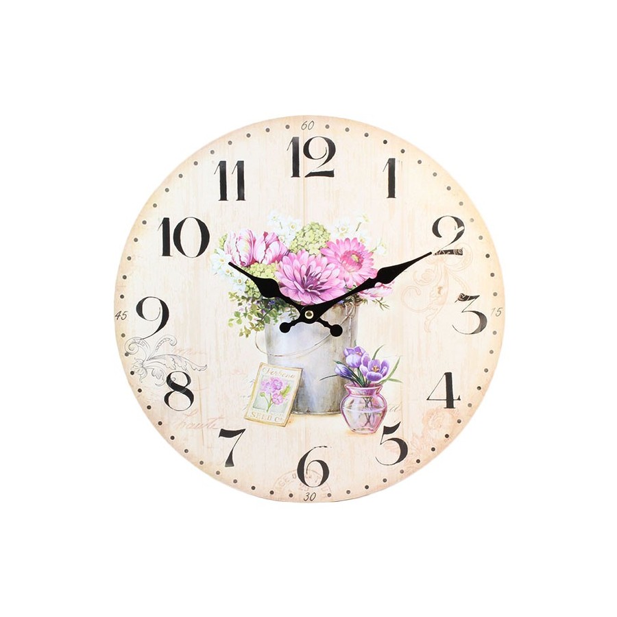 Na planie koła wykonano zegar reprezentujący styl prowansalski w pełnej krasie. W centralnej części przedmiotu umieszczono grafikę z metalowym wiaderkiem, po brzegi wypełnionym cudownymi kwiatami. Tarcza zegara jest czytelna a wskazówki mają ładny, zgrabny kształt. Zegar przepięknie wpasuje się w przestrzeń kuchenną – jest delikatny, subtelny a kolorystyka uspokajająca.