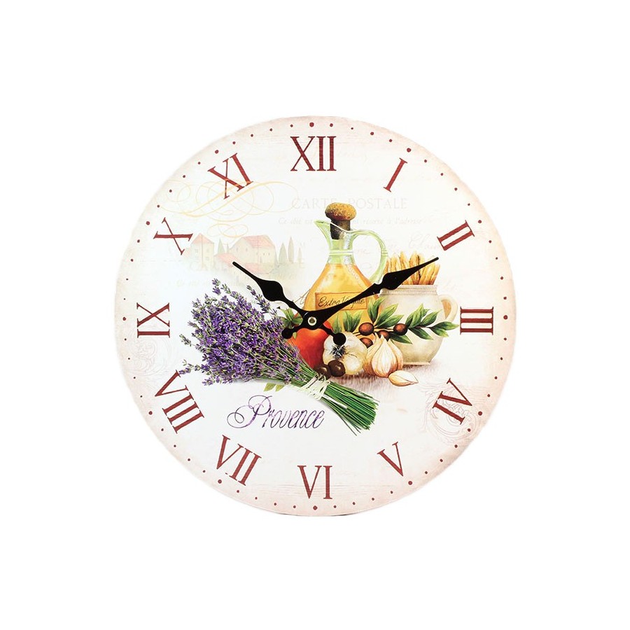 Zegary ścienne to zegary do kuchni, z uroczymi motywami bukietu kwitnącej lawendy, dzbana z oliwą z oliwek, gałązki oliwnej i plonów natury. Całość tła, wraz z napisem "Prowance" wpisana jest w styl prowansalski, który w niezwykły sposób podkreśla domową atmosferę. Dzięki dobrze dobranej kolorystyce, wskazówki i cyfry na tarczy są dobrze widoczne. Zegar do kuchni zasilany jest pojedynczą baterią AA( zwykły paluszek).