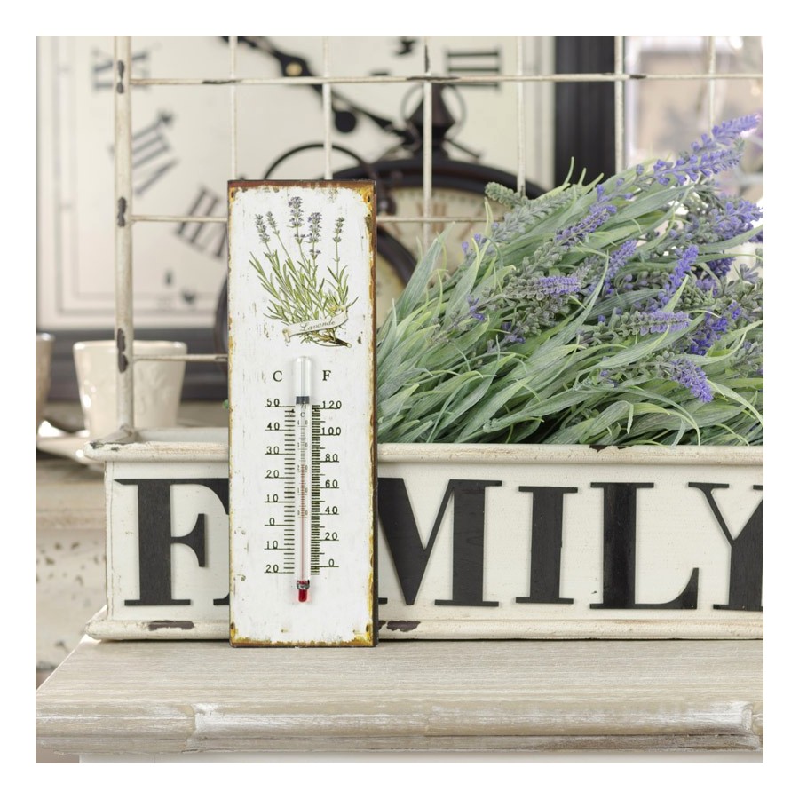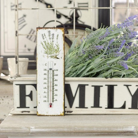 Prosty, ale bardzo urokliwy termometr retro, przystosowany do pokojowych temperatur. Wykonany z metalowej płytki, na którym motyw lawendy jest pierwszoplanową ozdobą. Dodatkowo specjalnie wykonane otarcia i zadrapania potęgują prawdziwy prowansalski styl.