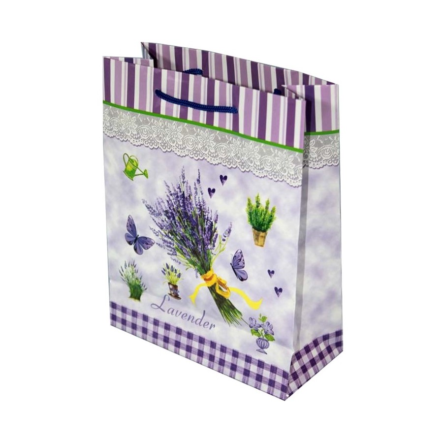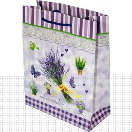 Prostokątna torebka na prezenty lawenda to torebka w średnim rozmiarze, wyposażona w wygodny sznurek, za pomocą, którego można trzymać prezent. Grafika torebki składa się z mieszaniny elementów: wiązanek i doniczek z lawendą, motyli, konewki. Na górze torebki umieszczono wzór w paski, a pod spodem koronkowe zdobienie. Na dole zaś, widnieje pasek dekorowania w uroczą kratkę.