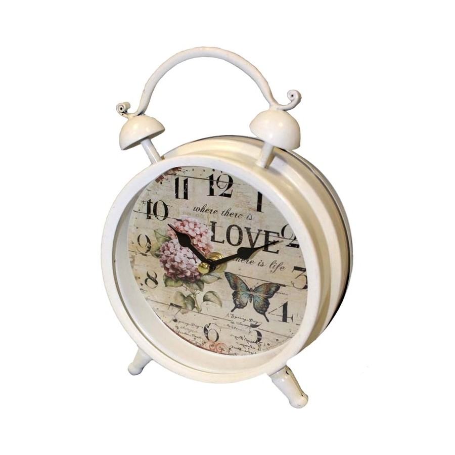 Wykonane z metalu zegary prowansalskie to zegary stojące doskonale nadające się na prezent czy jako piękny i praktyczny dodatek do wnętrza. Są to zegary w kształcie budzików, z charakterystycznym dla tej formy uchwytem. Całość kompozycji uzupełniona jest o uroczą tarczę w iśćie prowansalskimi motywami: kwitnących bzów i wielobarwnego motyla na tle delikatnych napisów w jezyku obcym.
