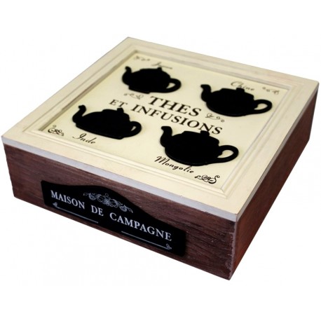 Prezentujemy drewniane pudełko na herbatę z praktycznymi i przydatnymi czterema przegródkami, które nie pozwolą na wymieszanie się różnych rodzajów herbat. Dzięki szczelnemu zamknięciu herbaty pozostaną na dłużej świeże i aromatyczne. Elegancka grafika z motywem czajniczków i napisami sprawia, że pudełko staje się reprezentatywne i może stać w centralnym miejscu w każdej kuchni.
