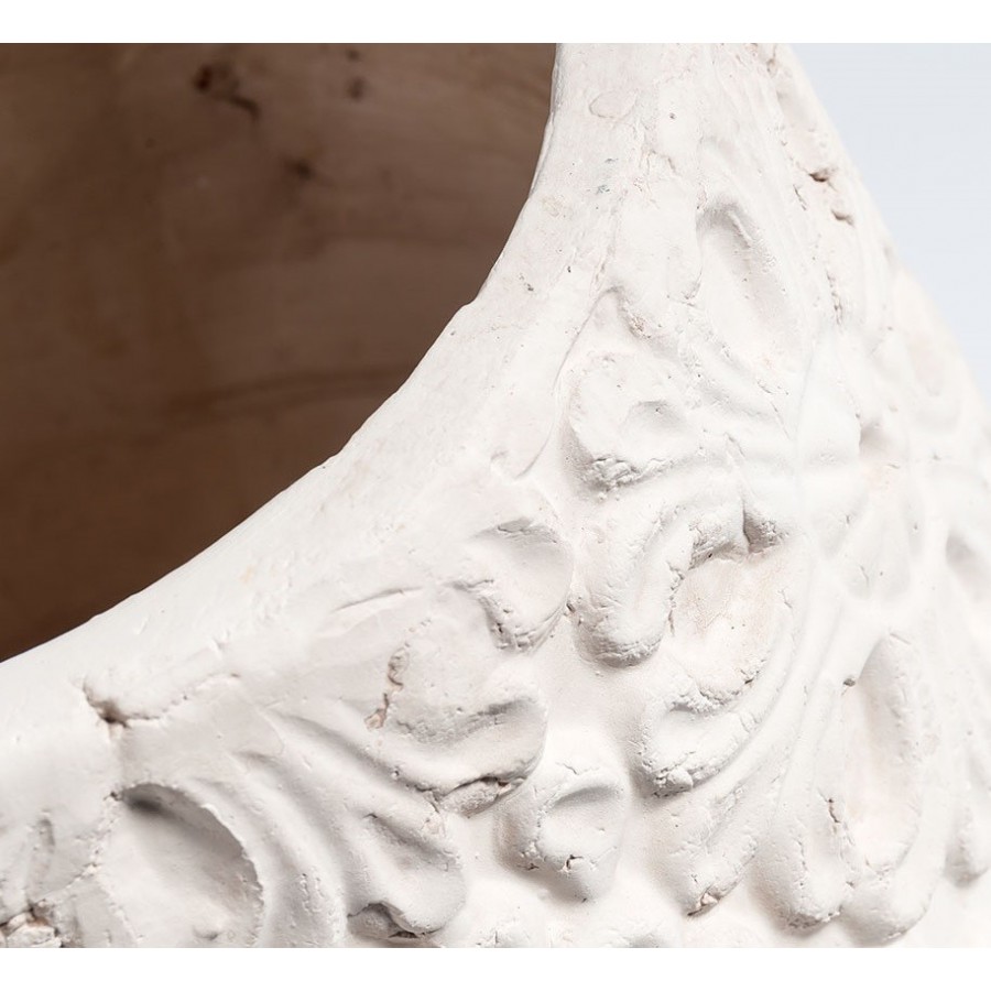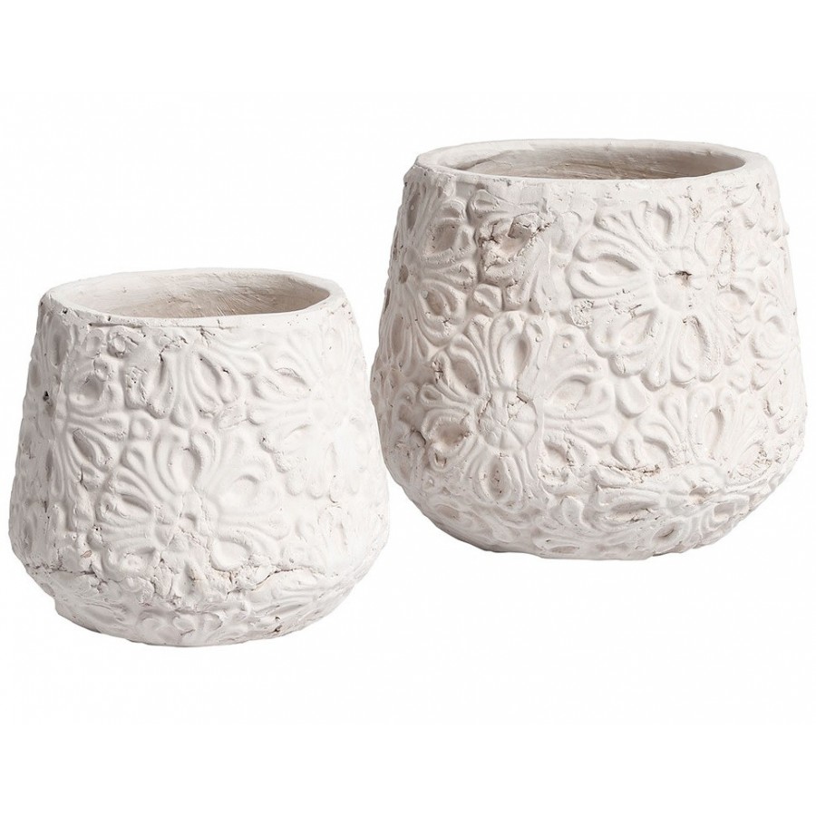 Osłonki na doniczki Belldeco wykonano z terakoty oraz opatrzono wytłoczeniem w kształcie kwiecistego wzoru.