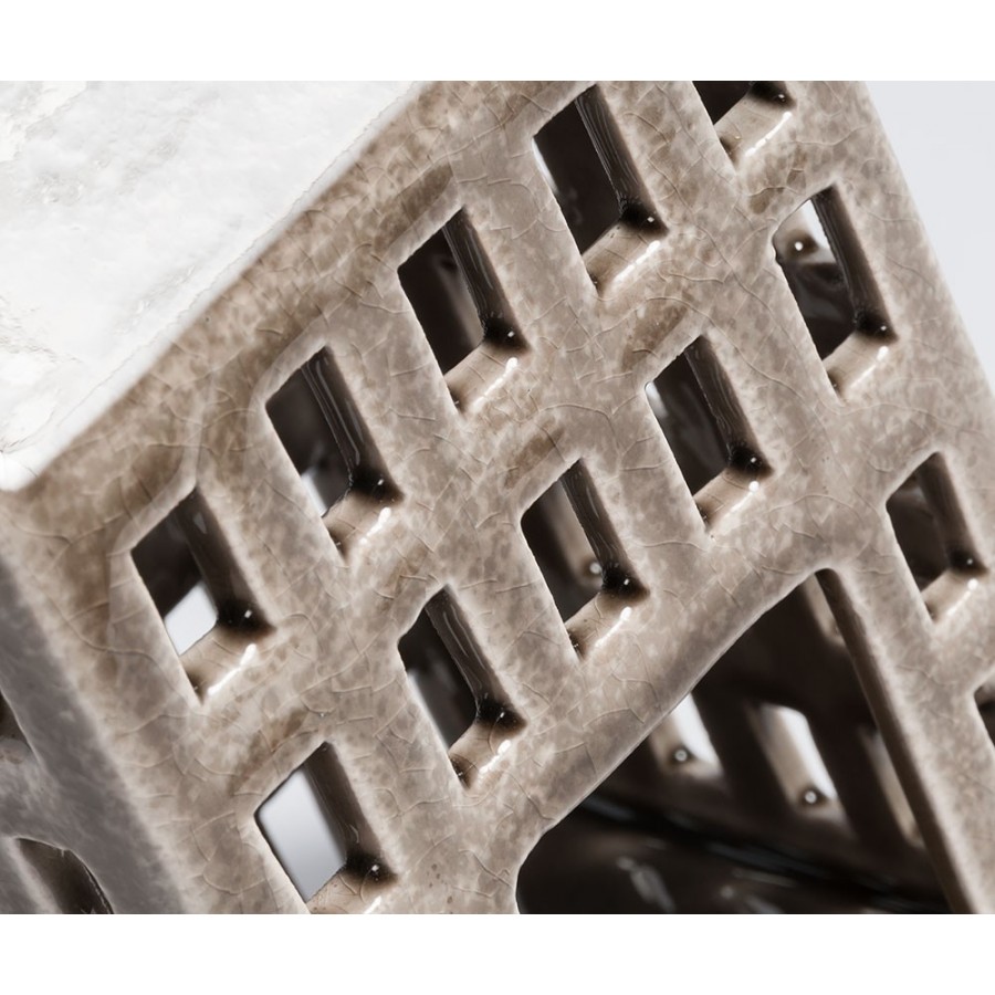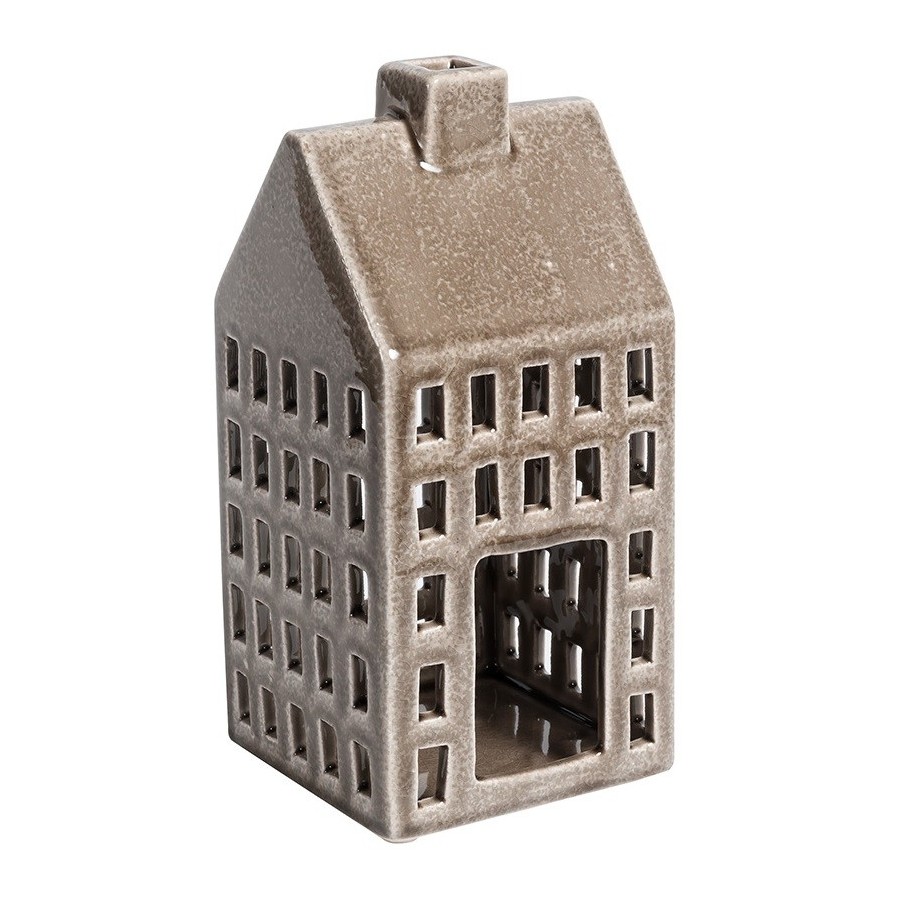 Lampion Belldeco to wykonany z ceramiki lampion domek na podstawie kwadratu z pięcioma piętrami wypełnionymi szeregiem otwórów imitujących okienka. Szczyt budynku uwieńczony jest kaminem. Całość jest delikatnie lakierowana, w kolorach szarości i bieli.