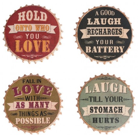 Kolorowe podkładki retro to kolejna propozycja marki Belldeco, która w niebanalny i nowatorski sposób udekoruje przestrzeń Twojego stołu. Podkładki są w kształcie kapsli do butelek a ich kolorystyka przyciąga wzrok. Optymistyczne napisy, umieszczone na przedmiotach są napisane ładną i czytelną czcionką. Zachęcamy! W komplecie cztery różne podkładki w kształcie kapsli od butelek.