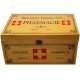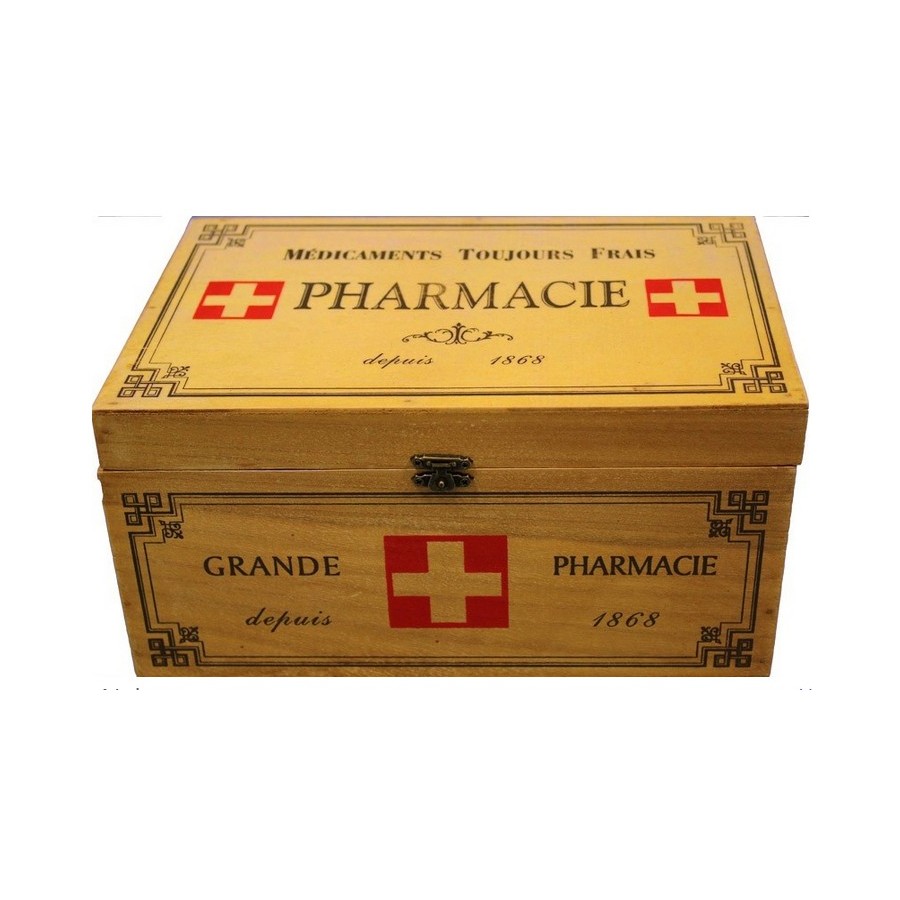 Przepiękna apteczka drewniana służąca do przechowywania lekarstw to pojemne pudełko ozdobione napisami.