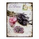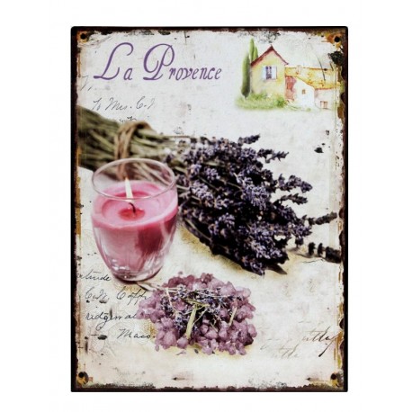 Metalowe tabliczki w stylu francuskim to prostokątne obrazki wykonane na beżowym tle wyposażonym w przetarcia oraz postarzenia. W centralnej części tabliczki znajduje się grafika z zapaloną świecą i lawendą. U góry natomiast przewidziano miejsce dla wizerunku prowansalskiego domostwa oraz napisu w języku francuskim.