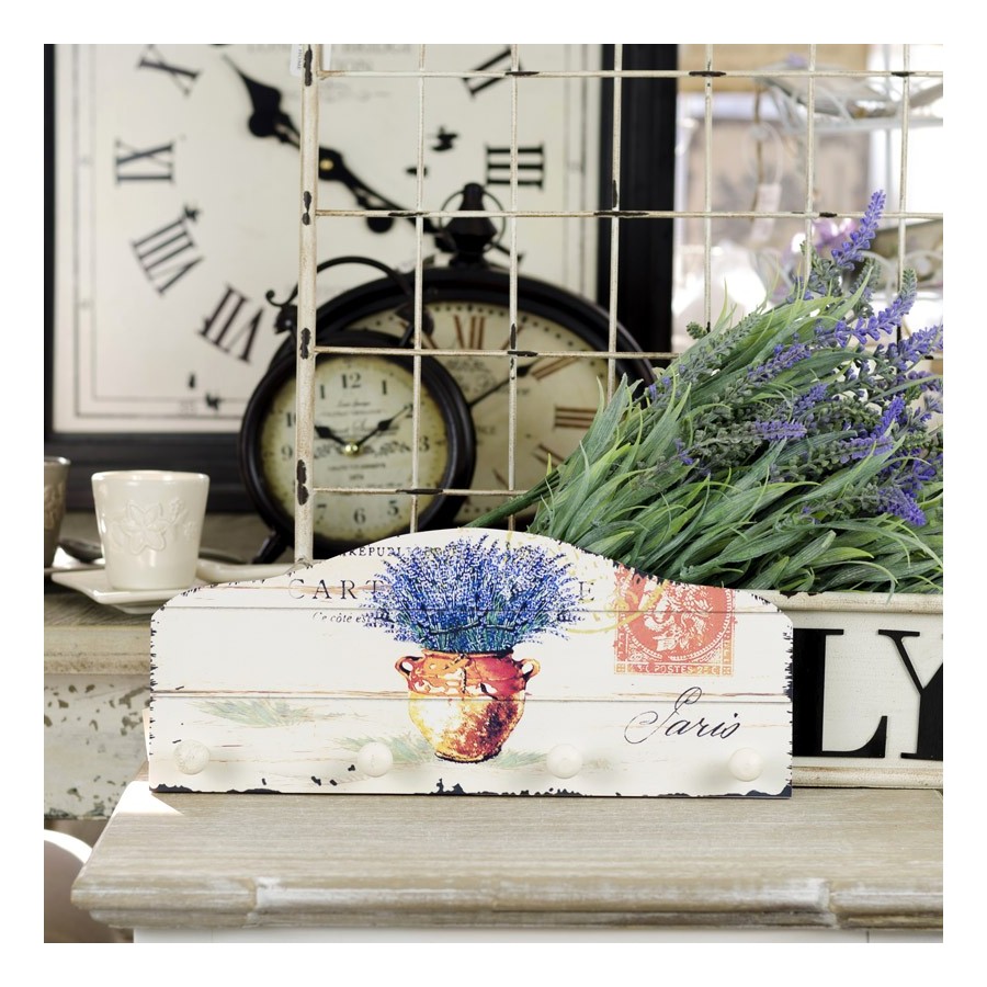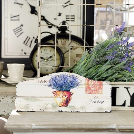 Wieszaki ścienne z symetrycznie wyciętym zdobnym szczytem, posiada cztery uchwyty na których powiesić możemy ściereczki, ręczniki, ubrania... Wieszak z lawendą wyróżnia się fantastycznym tłem - na drewnianej powierzchni znajduje się wazon pełen kwitnące lawendy na tle przypominający kartkę pocztową. Wszystko spisane w modny styl prowansalski.