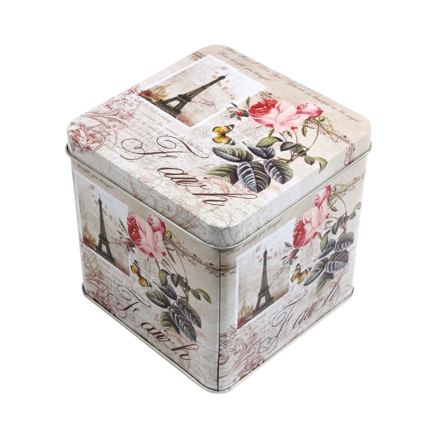 Metalowy pojemnik Paris to wyjątkowe pudełeczko, wyposażone w wygodną pokrywkę. Wnętrze pudełka przeznaczone jest dla Ciebie i Twojej wyobraźni – możesz umieścić w nim, co chcesz – cenne pamiątki lub niesforne bibeloty. Szata graficzna pudełeczka to przepiękny kolaż składający się z obrazków wieży Eiffla, róż oraz napisów.