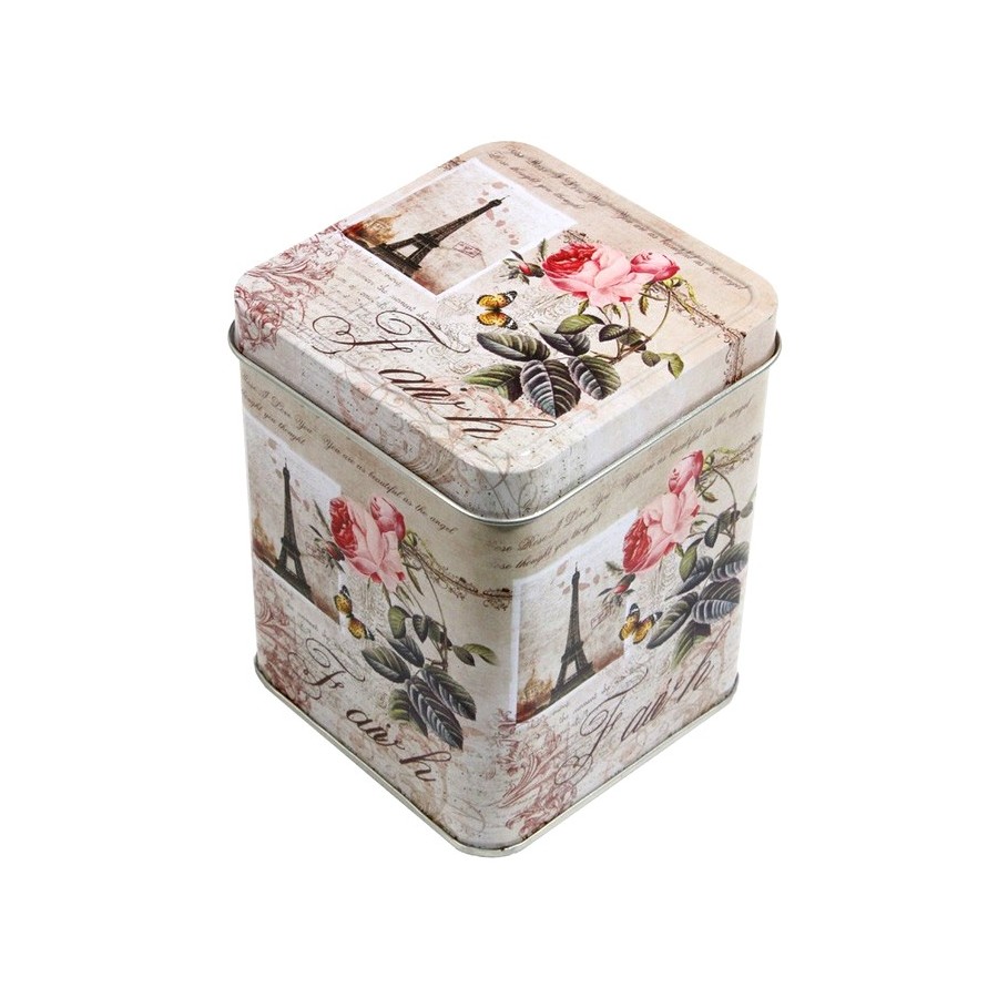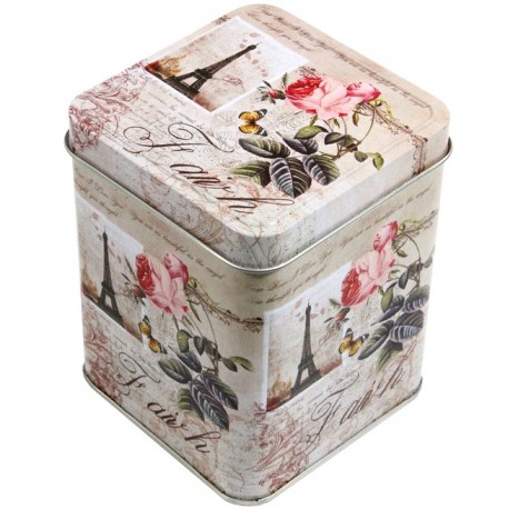 Metalowe pojemniki Paris to pudełka ozdobione piękną grafiką z wieżą Eiffla oraz pąkami róż.