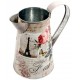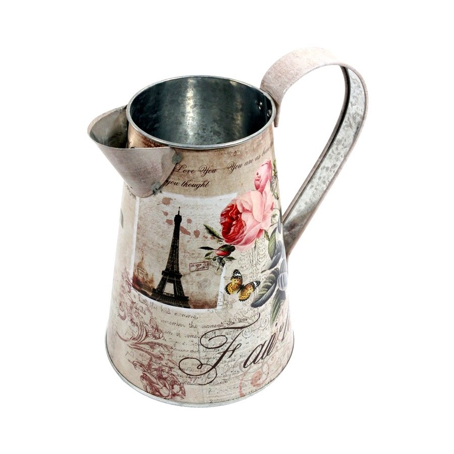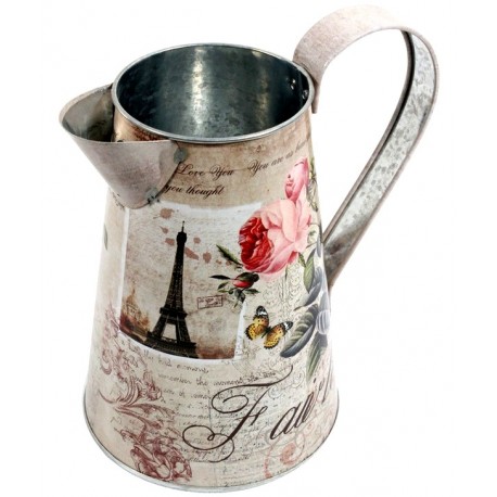 Kształtny dzban z metalu został wyposażony w pokaźny uchwyt do trzymania. Ten cudownie prezentujący się przedmiot można wykorzystać, jako metalową osłonkę na doniczki lub uroczo wyglądający wazon. Powierzchnię dzbanka wyposażono w szereg elementów, a są to wizerunki listów ze zdjęciem paryskiej wieży Eiffla, rozłożystych róż oraz czarno-słonecznego motyla.