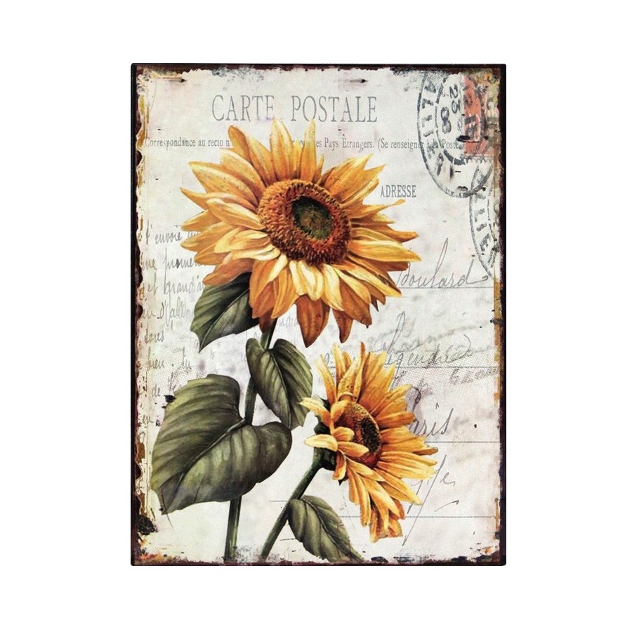 Prostokątne tabliczki wykonano we francuskim stylu i nadano im tło zapisanej karty pocztowej z odciskami stempli. W centralnej części tabliczki został naniesiony motyw kwiatów słonecznika, którego płatki mają barwę pełnej żółci w słonecznym odcieniu. Tabliczki prezentują się korzystnie i nieco ocieplają wnętrze.