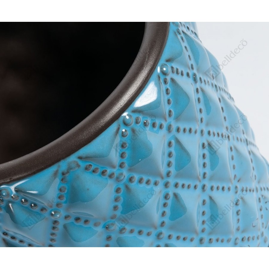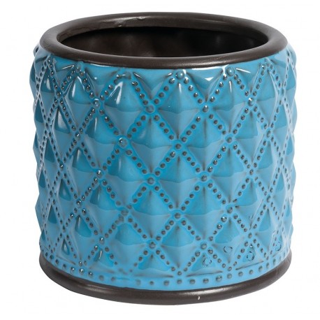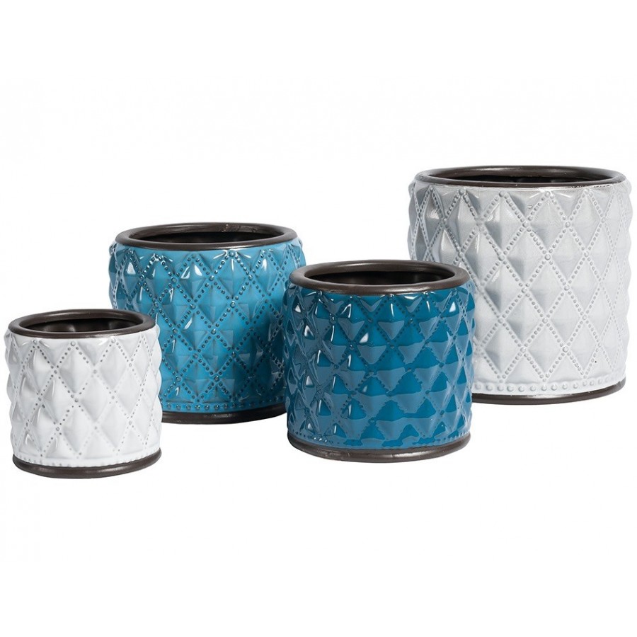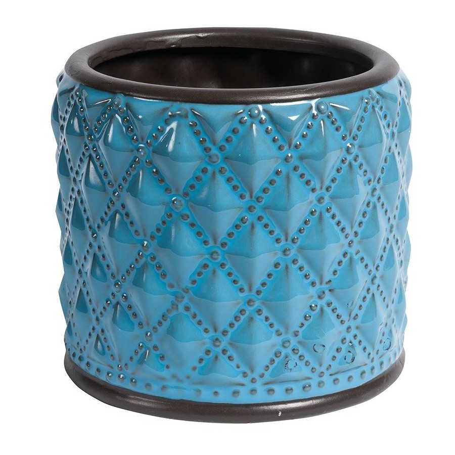 W niezwykły sposób podkreślące charakter Twojego ogrodu czy tarasu osłonki ceramiczne z kolekcji Blue Marine, w kontrastujących z klasyczną roślinną zielenią kolorach. Prosty kształt osłonki na doniczki świetnie współgra z uwypuklonym wzorem składającym się z wielu symetrycznych rombów, podreślonych dodatkowo ciemniejszymi przebarwieniami.