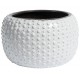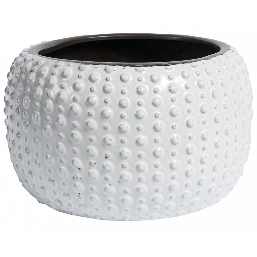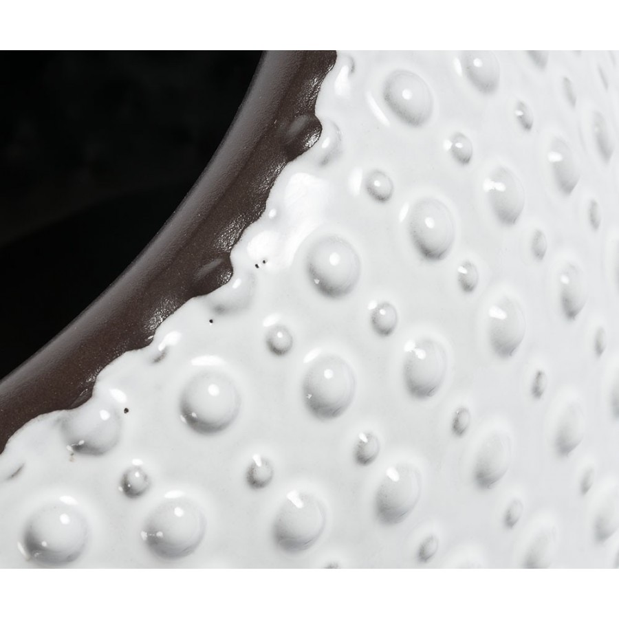 Osłonki ceramiczne Belldeco to przedmioty wykonane w kształcie pękatego słoja, których wnętrze zostało pokryte ciemno-brązową farbą w czekoladowym odcieniu. Zewnętrzne części ścianek zawierają liczne wypustki w dwóch rozmiarach, które pokryto białym kolorem. Osłonka prezentuje się uroczo i ciekawie!