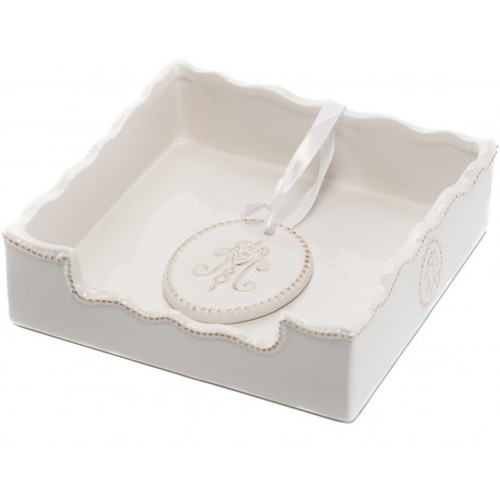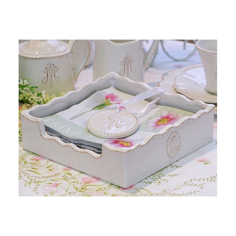 Ceramika w stylu prowansalskim to wspaniała ozdoba twojego domu, która również pełni praktyczną funkcję. Serwetnik prowansalski firmy Pierrot Home Design jest w kolorze kremowej bieli i ma kwadratowy kształt o nierównej linii. Wykonany jest z wysokiej klasy ceramiki a serwetki w nim ułożone przytrzymane są okrągłym przyciskiem z charakterystycznym logo w kształcie litery M. Przepięknie będzie wyglądał na stole podczas ważnych uroczystości.