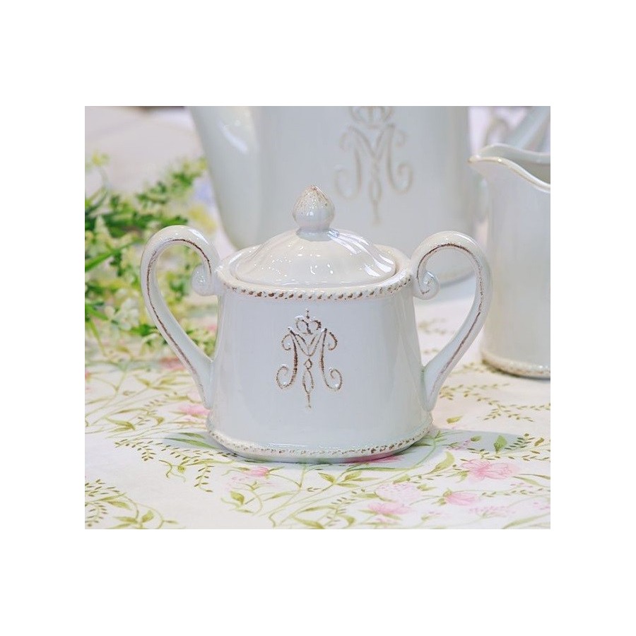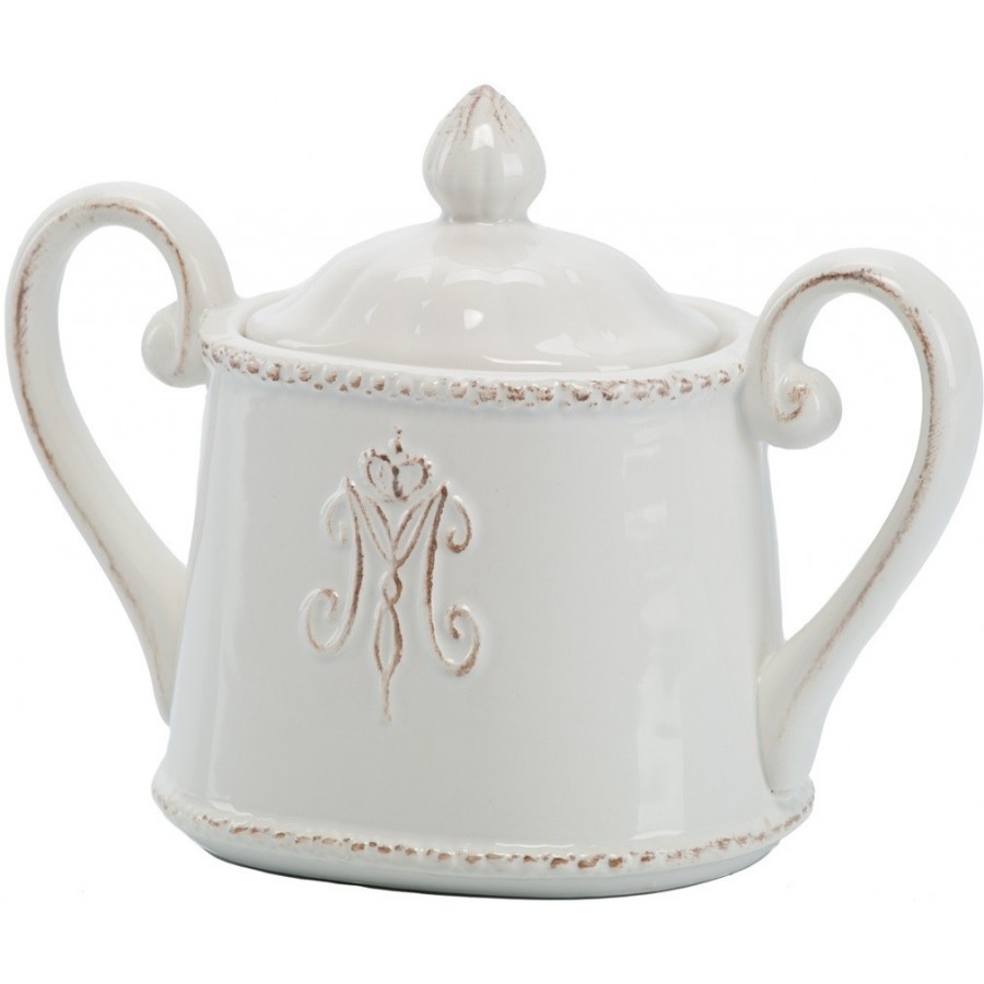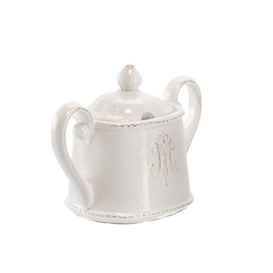 Kremowo-biała cukierniczka w stylu prowansalski to przykład na to że ceramika prowansalska potrafi połączyć w sobie funkcjonalność i piękny wygląd. Cukierniczka z pokrywką zapobiega zawilgotnieniu cukru, dzięki czemu zawsze jest sypki i świeży. Podwójne ucho ułatwia podniesienie cukierniczki z kazdej strony stołu.