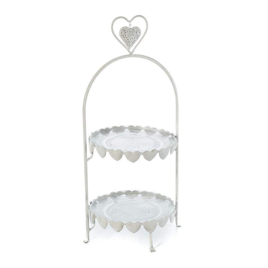 Romantyczna, metalowa etażerka z dwoma szklanymi półeczkami i motywem serc – idealna ozdoba kuchni.