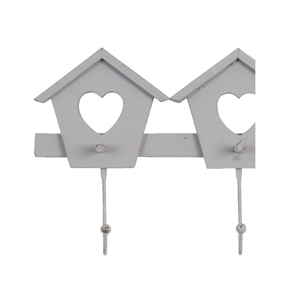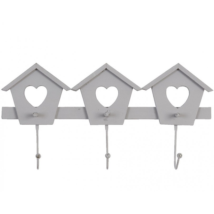 Pomysłowy wieszak ścienny domki wykonany został z drewna i wyposażony w trzy haczyki. Nad każdym z haczyków przymocowany jest domek z okienkiem w kształcie serduszka, a całość utrzymana jest w szarej kolorystyce. Wieszak idelanie pasuje do wnętrz urządzonych w stylu prowansalskim i skandynawskim.