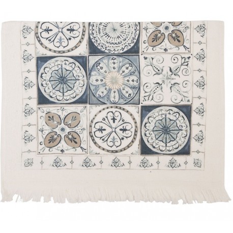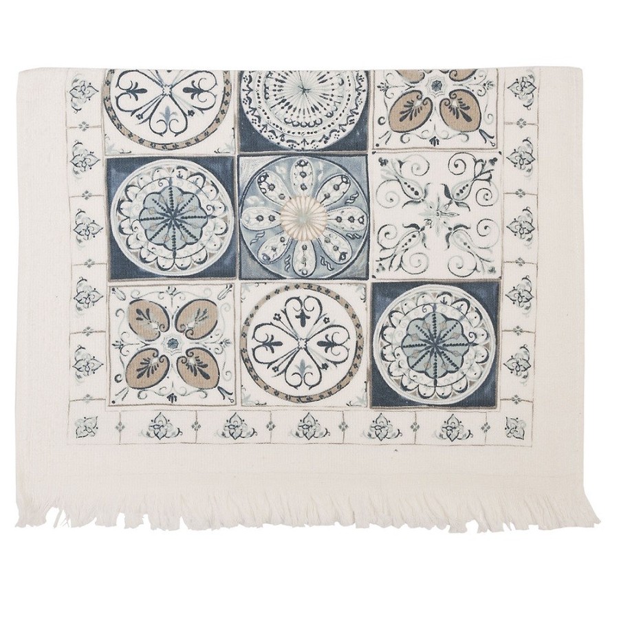 Zakończony frędzelkami ręcznik kuchenny w odcieniach bieli, beżu i różnych odmian błękitu. Zajrzyj już dziś!
