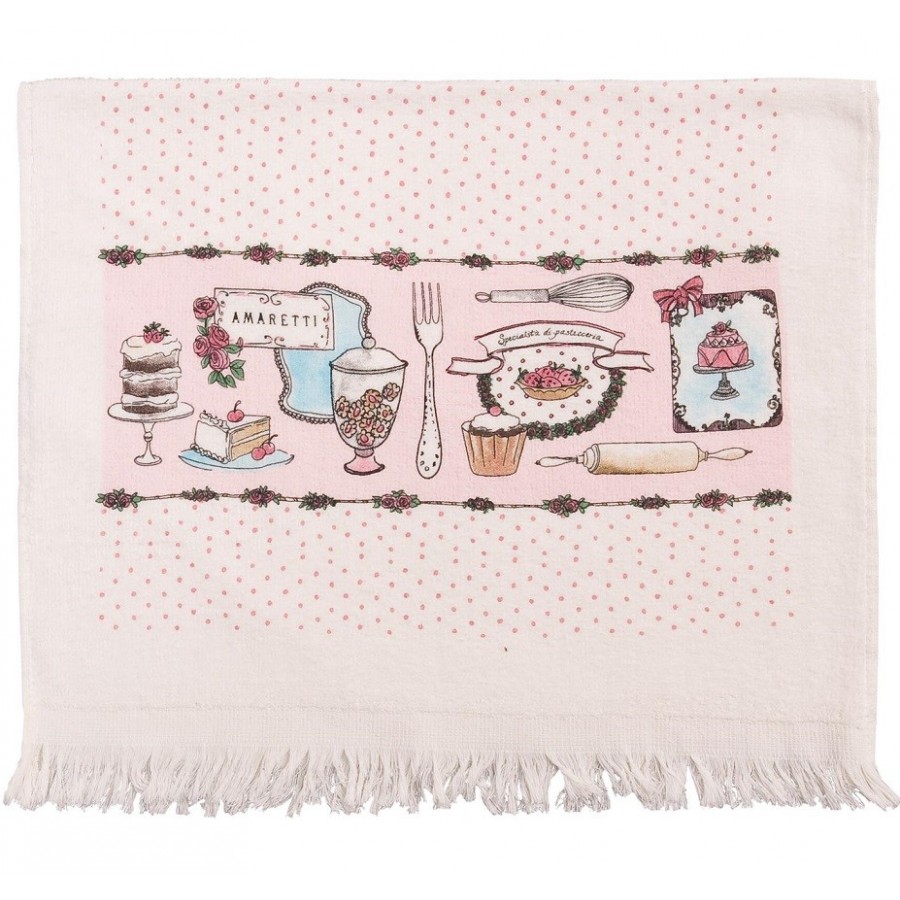 Słodki ręcznik kuchenny w różowej barwie ozdobiono wizerunkami babeczek z kremem, ciast oraz przyborów kuchennych.