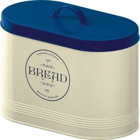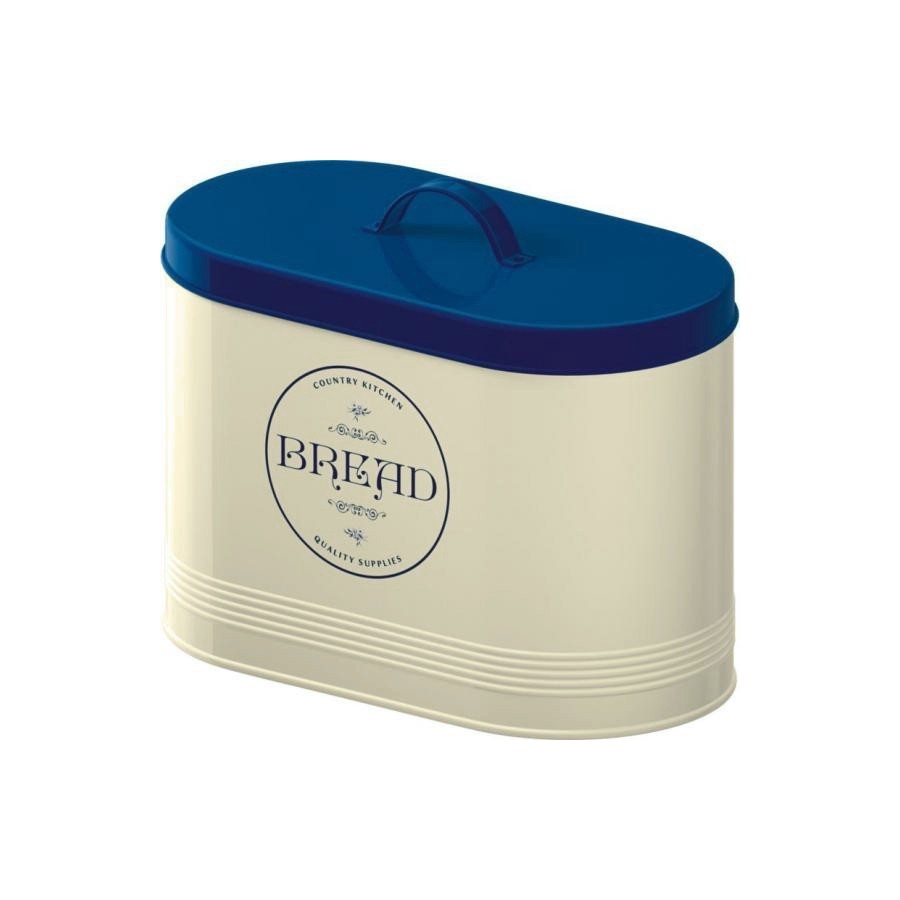 Biało-niebieski pojemnik na chleb z dużym napisem BREAD w środku kolistego emblematu. Ciekawy kształt!