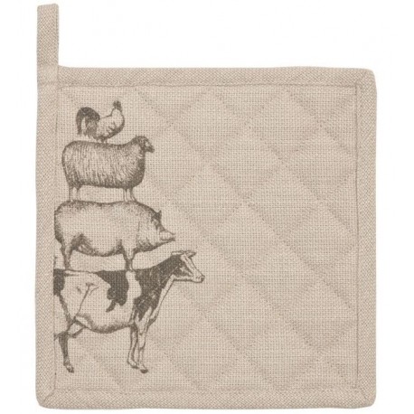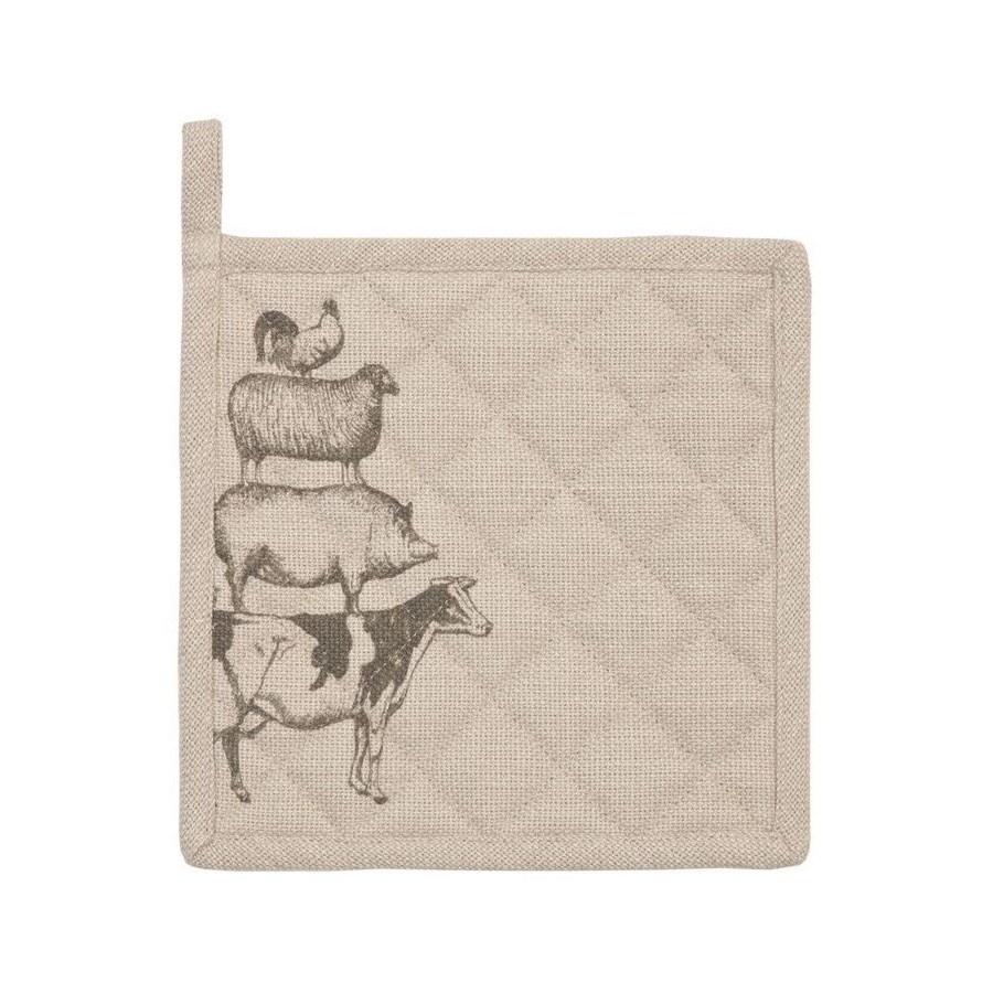 Kwadratowe chwytaki kuchenne w kolorze brązu korkowego zostały wykonane z bawełny a następnie ozdobione ładnym pikowaniem. Na powierzchni chwytaka umieszczono ciekawą grafikę – piramidę zbudowaną ze zwierząt, które odnajdziesz w wiejskiej zagrodzie: koguta, owcę, świnię i krowę. Polecamy inne dodatki do kuchni!