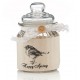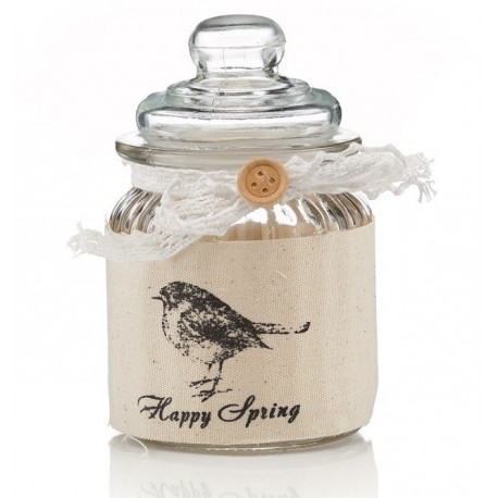 Prezentujemy szklany pojemnik z niepowtarzalnym zdobieniem w postaci materiału z nadrukowanym prześlicznym ptaszkiem i napisem Happy Spring oraz zawiązaną na zwężeniu koronką zakończoną guziczkiem. Szklany pojemnik może służyć w kuchni, a także jako szklana szkatułka. Urozmaici wnętrze wnosząc wiosenny powiew.
